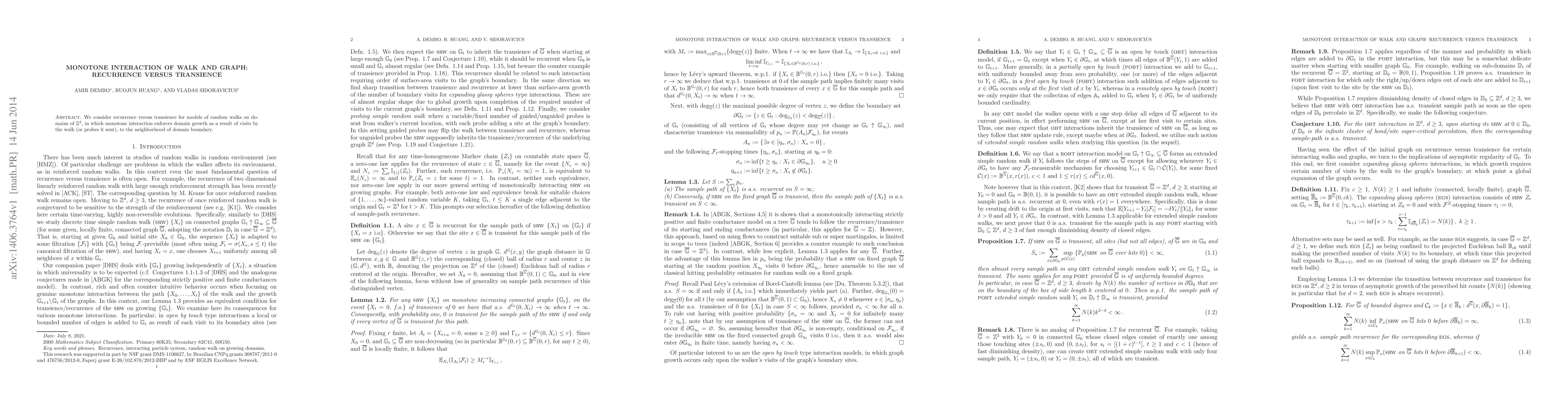 Summary: This paper investigates the recurrence versus transience behavior of random walks on growing domains in $\mathbb{Z}^d$ where the domain expands due to the walk's visits near the boundary, focusing on the monotone interaction effects.