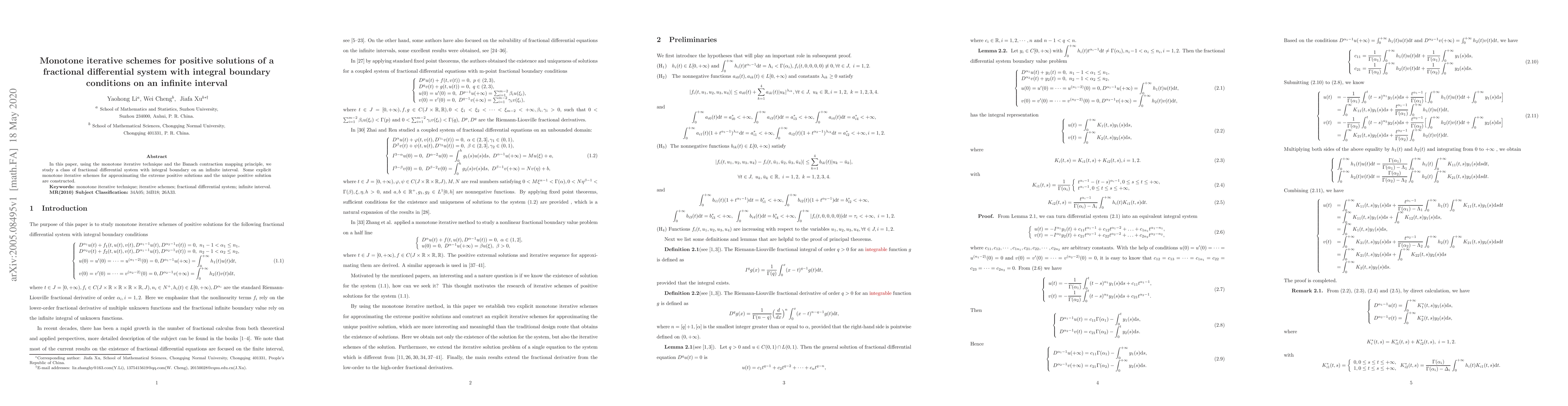 Summary: This paper employs monotone iterative techniques and the Banach contraction mapping principle to analyze a class of fractional differential systems with integral boundary conditions on an infinite interval. It constructs explicit monotone iterative schemes to approximate the extreme positive solutions and the unique positive solution.