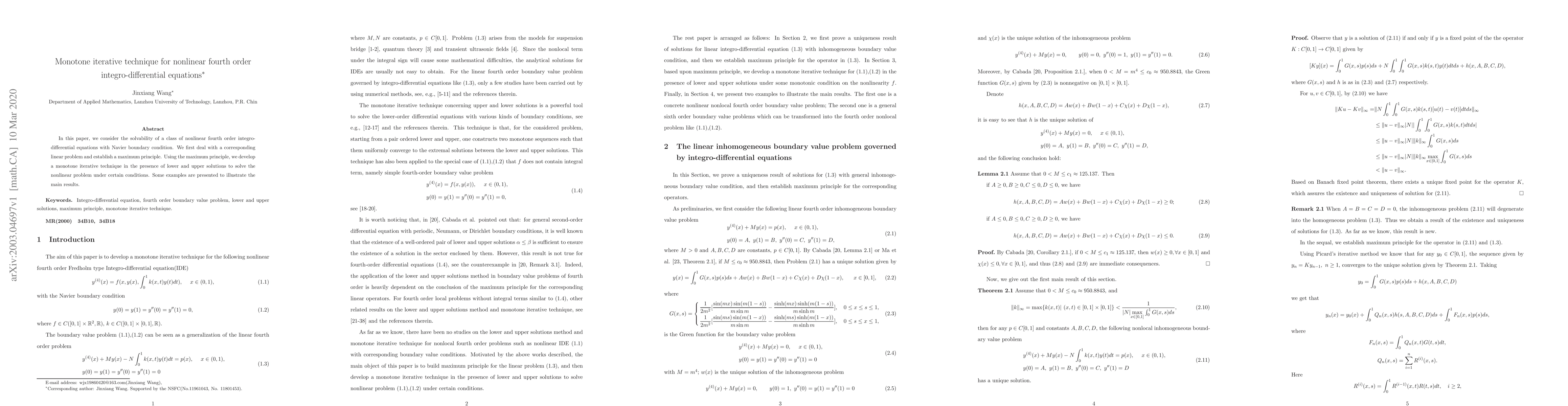 This paper explores the solvability of nonlinear fourth-order integro-differential equations with a focus on a monotone iterative technique. It establishes a maximum principle for the corresponding linear problem and applies it to develop a solution method using lower and upper solutions, illustrated with examples.