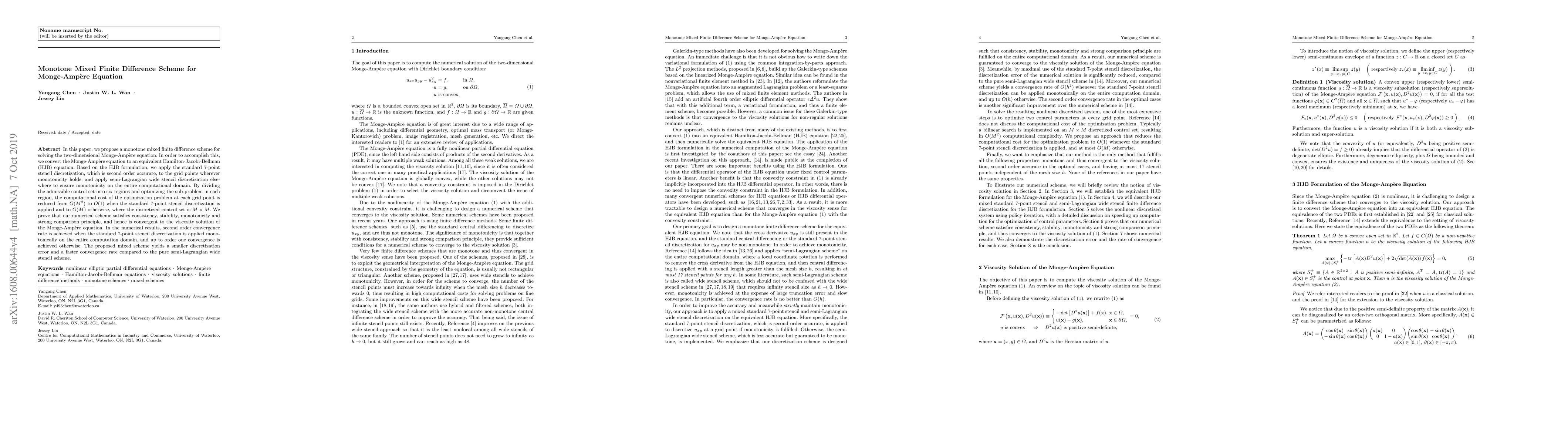 In this paper, we propose a monotone mixed finite difference scheme for solving the two-dimensional Monge-Amp\`ere equation. In order to accomplish this, we convert the Monge-Amp\`ere equation to an equivalent Hamilton-Jacobi-Bellman (HJB) equation. Based on the HJB formulation, we apply the standard 7-point stencil discretization, which is second order accurate, to the grid points wherever monotonicity holds, and apply semi-Lagrangian wide stencil discretization elsewhere to ensure monotonicity on the entire computational domain. By dividing the admissible control set into six regions and optimizing the sub-problem in each region, the computational cost of the optimization problem at each grid point is reduced from $O(M^2)$ to $O(1)$ when the standard 7-point stencil discretization is applied and to $O(M)$ otherwise, where the discretized control set is $M \times M$. We prove that our numerical scheme satisfies consistency, stability, monotonicity and strong comparison principle, and hence is convergent to the viscosity solution of the Monge-Amp\`ere equation. In the numerical results, second order convergence rate is achieved when the standard 7-point stencil discretization is applied monotonically on the entire computation domain, and up to order one convergence is achieved otherwise. The proposed mixed scheme yields a smaller discretization error and a faster convergence rate compared to the pure semi-Lagrangian wide stencil scheme.