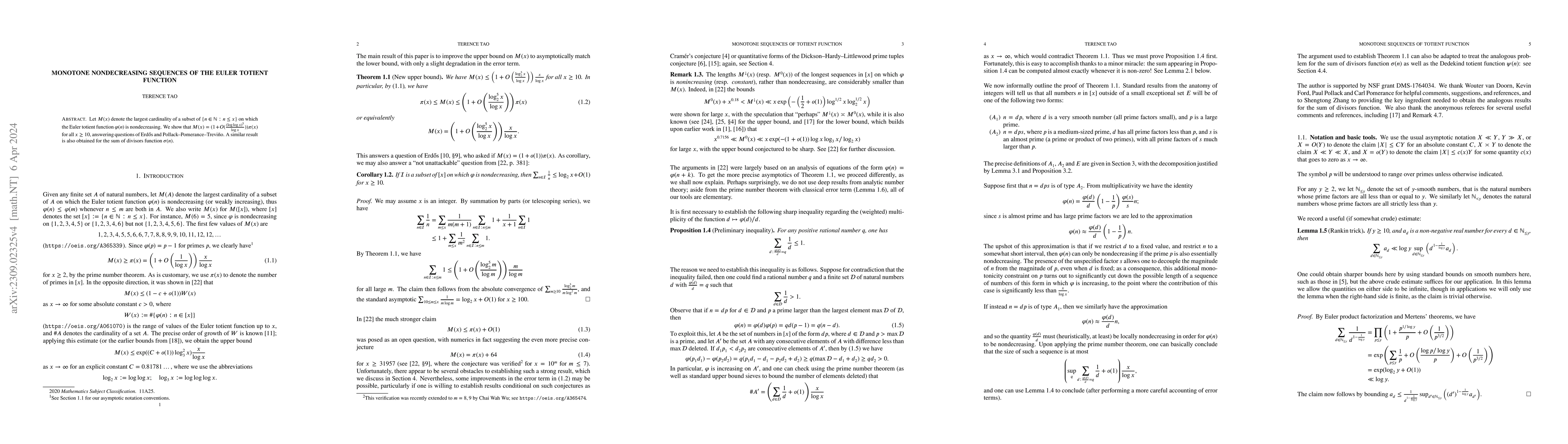 The paper determines the largest cardinality of subsets where the Euler totient function remains non-decreasing, proving $M(x) = (1+O(\frac{(\log\log x)^5}{\log x})) \pi(x)$ for $x \geq 10$. It also extends similar results to the sum of divisors function $\sigma(n)$.
