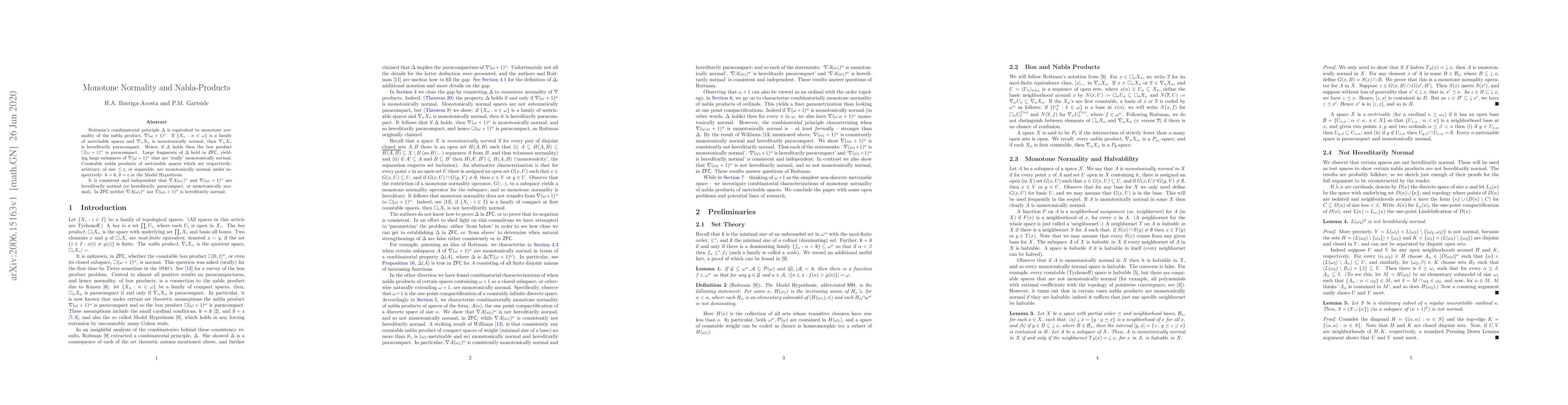 Roitman's combinatorial principle $\Delta$ is equivalent to monotone normality of the nabla product, $\nabla (\omega +1)^\omega$. If $\{ X_n : n\in \omega\}$ is a family of metrizable spaces and $\nabla_n X_n$ is monotonically normal, then $\nabla_n X_n$ is hereditarily paracompact. Hence, if $\Delta$ holds then the box product $\square (\omega +1)^\omega$ is paracompact. Large fragments of $\Delta$ hold in $\mathsf{ZFC}$, yielding large subspaces of $\nabla (\omega+1)^\omega$ that are `really' monotonically normal. Countable nabla products of metrizable spaces which are respectively: arbitrary, of size $\le \mathfrak{c}$, or separable, are monotonically normal under respectively: $\mathfrak{b}=\mathfrak{d}$, $\mathfrak{d}=\mathfrak{c}$ or the Model Hypothesis. It is consistent and independent that $\nabla A(\omega_1)^\omega$ and $\nabla (\omega_1+1)^\omega$ are hereditarily normal (or hereditarily paracompact, or monotonically normal). In $\mathsf{ZFC}$ neither $\nabla A(\omega_2)^\omega$ nor $\nabla (\omega_2+1)^\omega$ is hereditarily normal.
