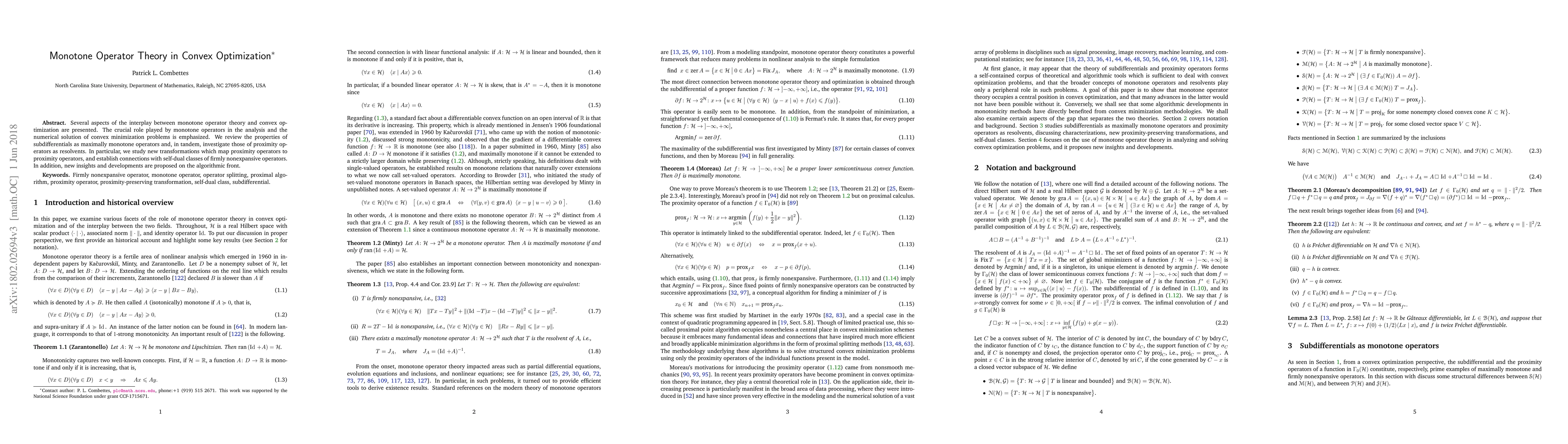 Several aspects of the interplay between monotone operator theory and convex optimization are presented. The crucial role played by monotone operators in the analysis and the numerical solution of convex minimization problems is emphasized. We review the properties of subdifferentials as maximally monotone operators and, in tandem, investigate those of proximity operators as resolvents. In particular, we study new transformations which map proximity operators to proximity operators, and establish connections with self-dual classes of firmly nonexpansive operators. In addition, new insights and developments are proposed on the algorithmic front.