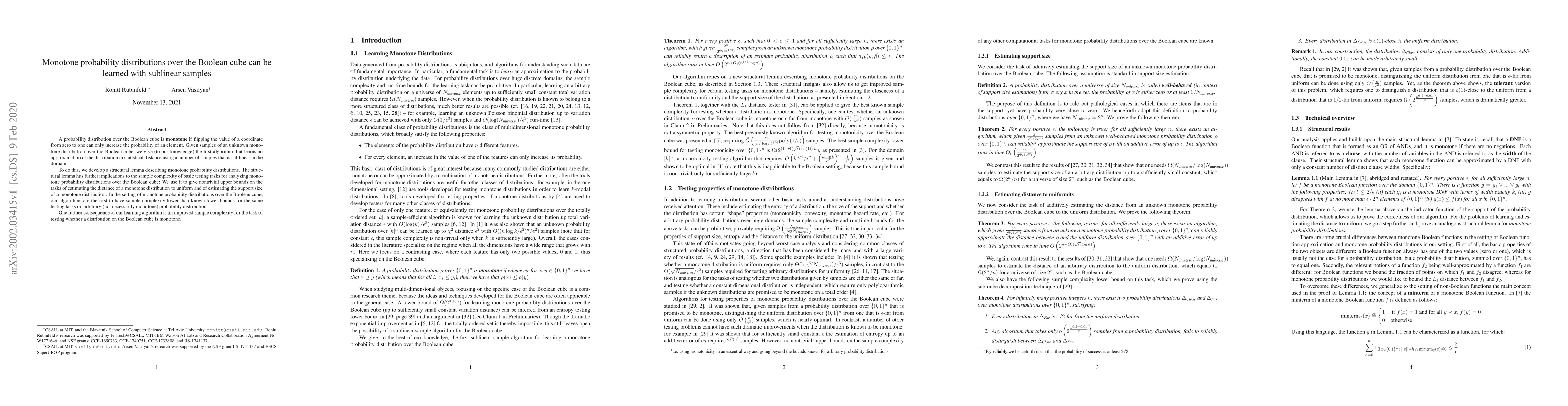 This paper presents the first algorithm to learn monotone probability distributions over the Boolean cube using sublinear samples, leveraging a structural lemma to achieve this. The algorithm also provides improved sample complexities for estimating the distance to uniform and support size, and testing monotonicity.
