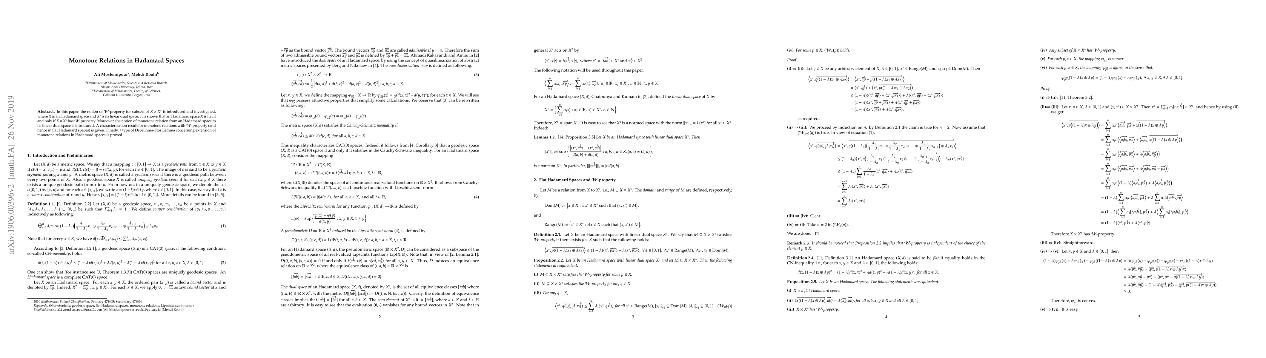 This paper introduces the $\mathcal{W}$-property for subsets of Hadamard spaces and their linear duals, showing that a Hadamard space is flat if and only if this property holds for its product with its dual. It also defines monotone relations between Hadamard spaces and their duals, ultimately proving a characterization for such relations with the $\mathcal{W}$-property in flat spaces.