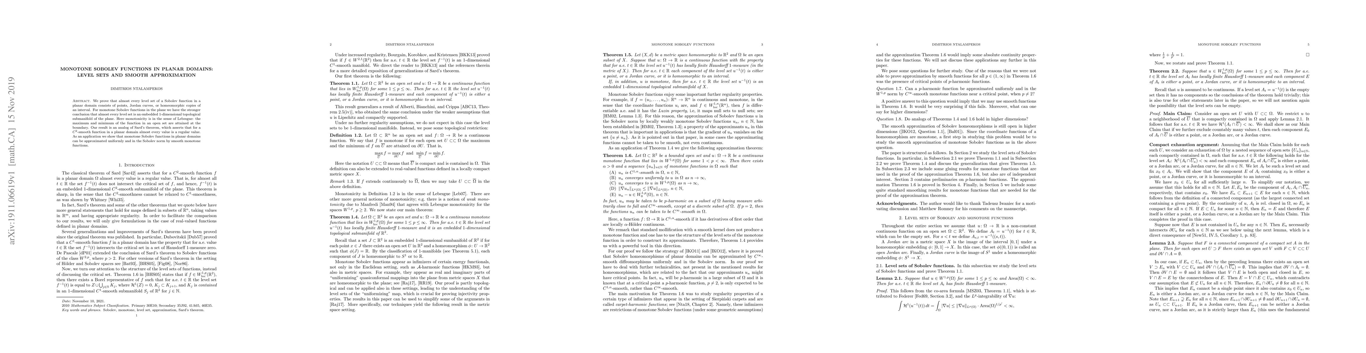 This paper proves that almost every level set of a Sobolev function in a planar domain is either a point, a Jordan curve, or a homeomorphic copy of an interval. For monotone Sobolev functions, almost every level set is an embedded 1-dimensional topological submanifold. The result is an analog of Sard's theorem for smooth functions and demonstrates the uniform approximation of monotone Sobolev functions by smooth ones.