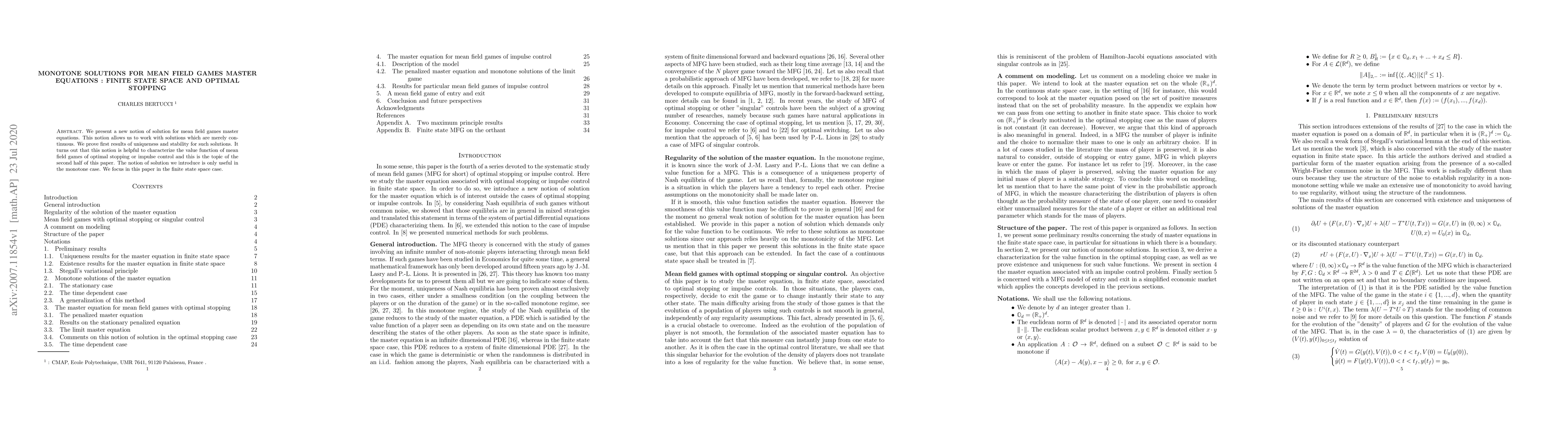 We present a new notion of solution for mean field games master equations. This notion allows us to work with solutions which are merely continuous. We prove first results of uniqueness and stability for such solutions. It turns out that this notion is helpful to characterize the value function of mean field games of optimal stopping or impulse control and this is the topic of the second half of this paper. The notion of solution we introduce is only useful in the monotone case. We focus in this paper in the finite state space case.