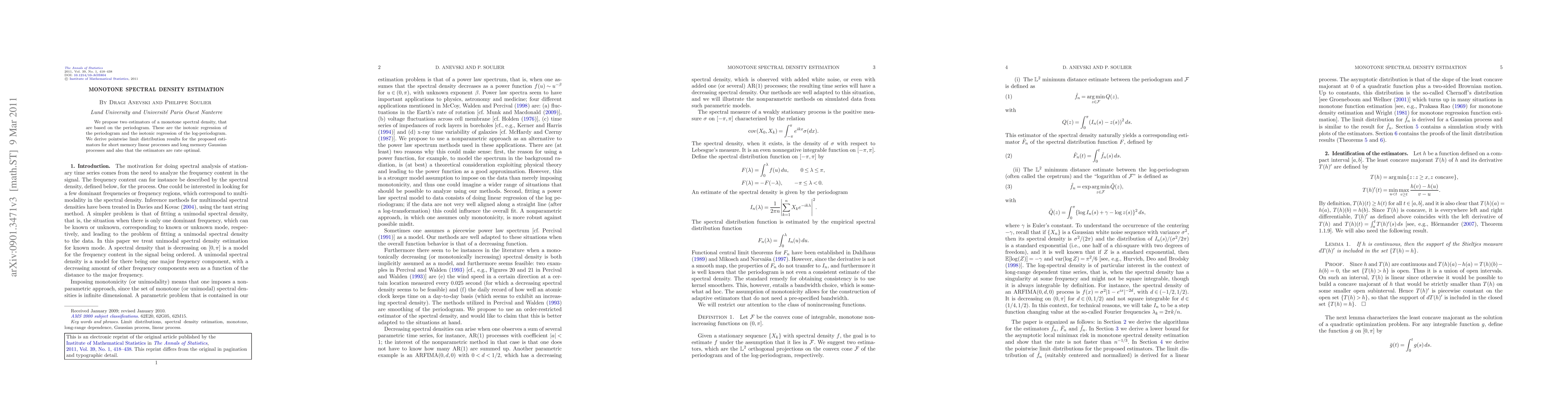 This paper proposes two isotonic regression-based estimators for monotone spectral density: one from the periodogram and the other from the log-periodogram. It establishes their limit distributions and proves their rate optimality for both short memory and long memory linear processes.