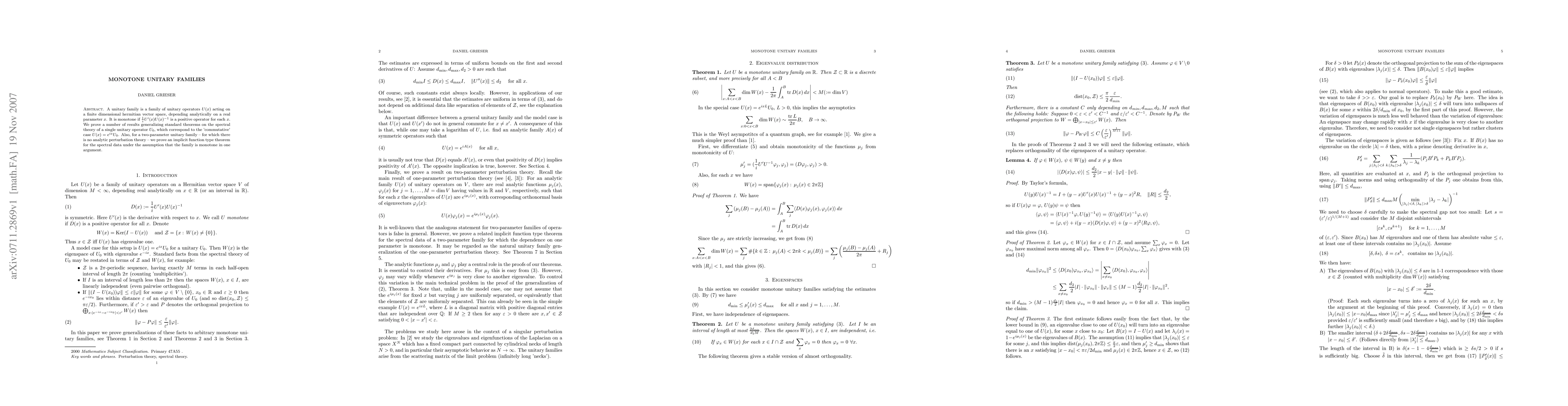 A unitary family is a family of unitary operators $U(x)$ acting on a finite dimensional hermitian vector space, depending analytically on a real parameter $x$. It is monotone if $\frac1i U'(x)U(x)^{-1}$ is a positive operator for each $x$. We prove a number of results generalizing standard theorems on the spectral theory of a single unitary operator $U_0$, which correspond to the 'commutative' case $U(x)=e^{ix}U_0$. Also, for a two-parameter unitary family -- for which there is no analytic perturbation theory -- we prove an implicit function type theorem for the spectral data under the assumption that the family is monotone in one argument.