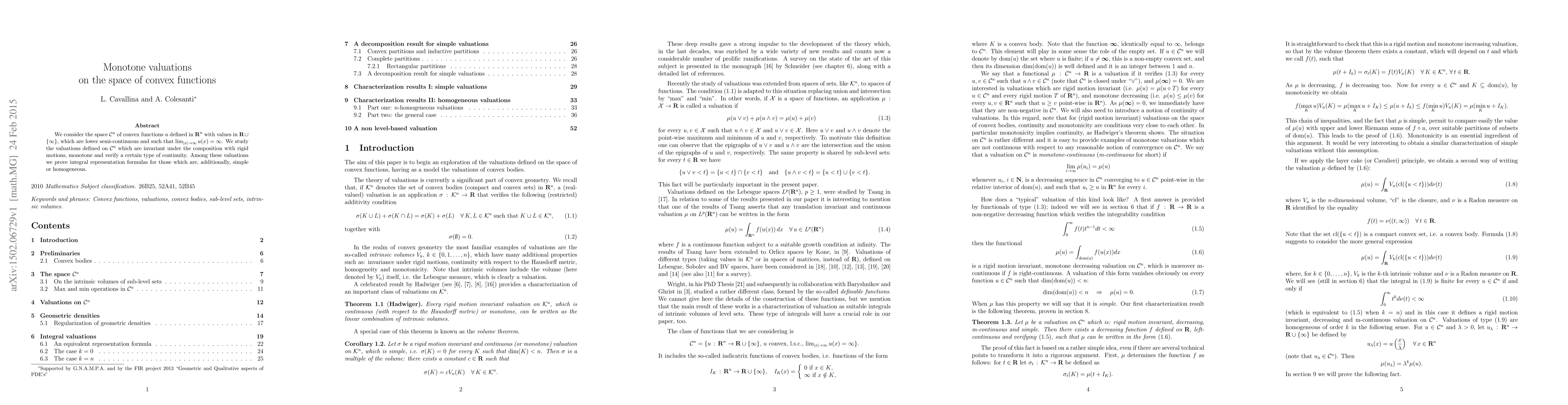 This paper investigates valuations on the space of lower semi-continuous convex functions in $n$-dimensional Euclidean space, focusing on those invariant under rigid motions, monotone, and continuous. It proves integral representation formulas for valuations that are simple or homogeneous.