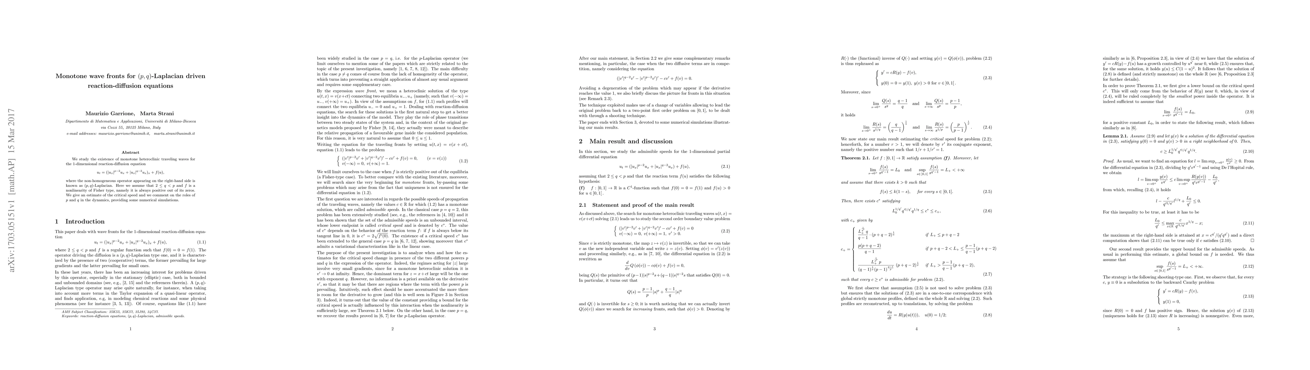 This paper studies the existence of monotone wave fronts for a 1D reaction-diffusion equation driven by a $(p, q)$-Laplacian operator, focusing on its critical speed and dynamics influenced by parameters $p$ and $q.