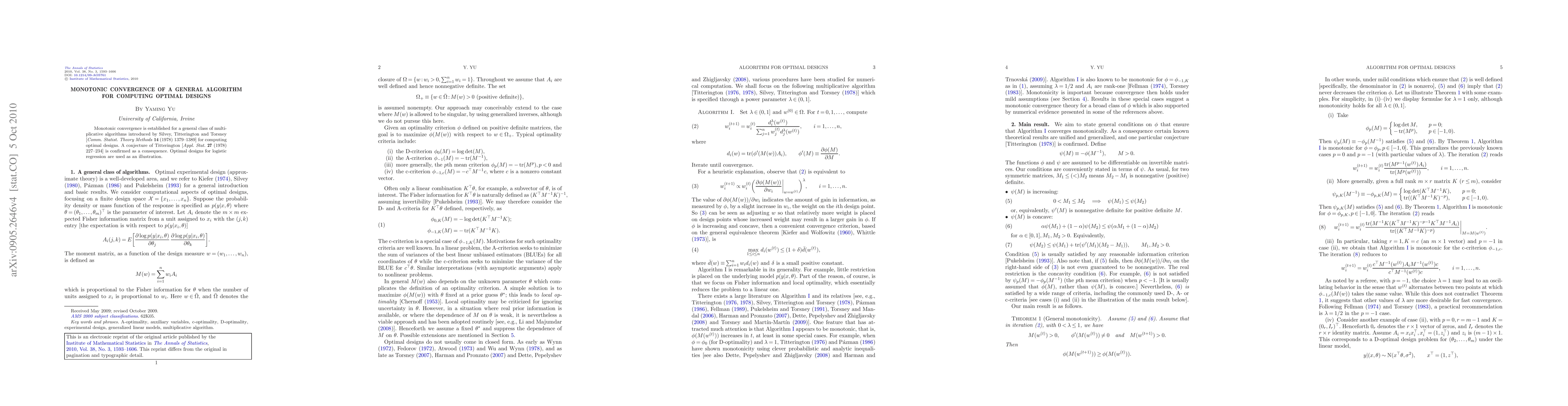 This paper confirms the monotonic convergence of Silvey, Titterington, and Torsney's general algorithm for computing optimal designs, validating a conjecture by Titterington. The study uses optimal designs for logistic regression to illustrate the algorithm's effectiveness.