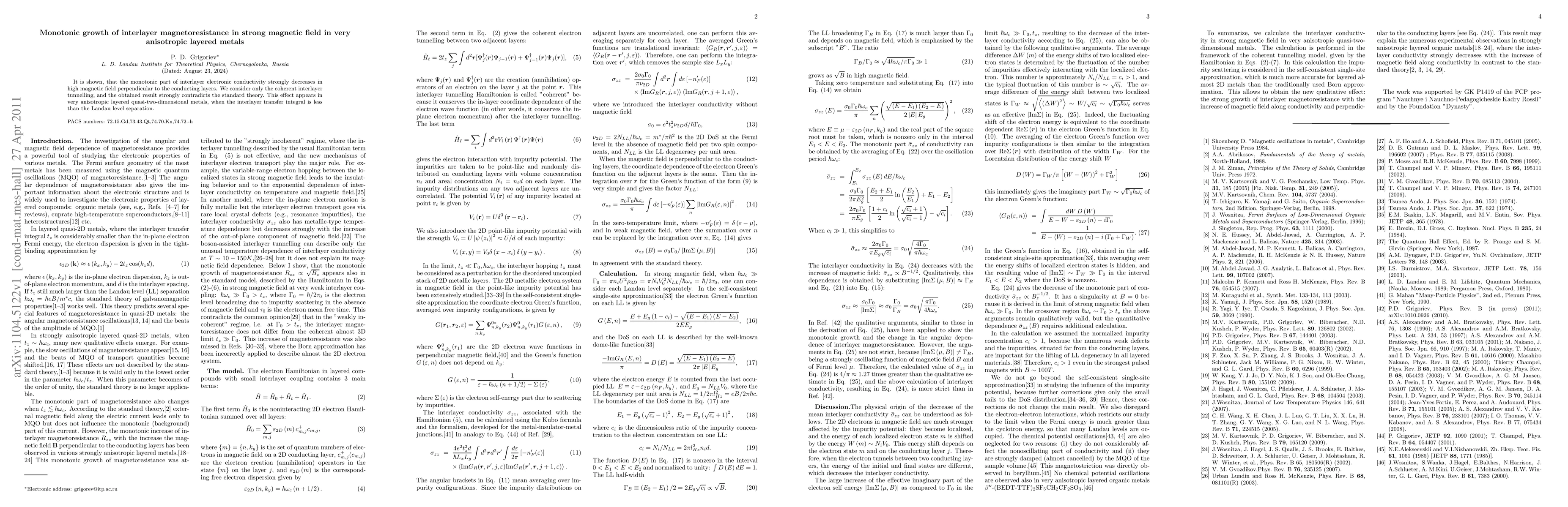 This study reveals that interlayer electronic conductivity in anisotropic layered quasi-two-dimensional metals decreases monotonically under high perpendicular magnetic fields, contradicting conventional theory and occurring when interlayer transfer integral is smaller than the Landau level separation. This effect is attributed to coherent interlayer tunneling.