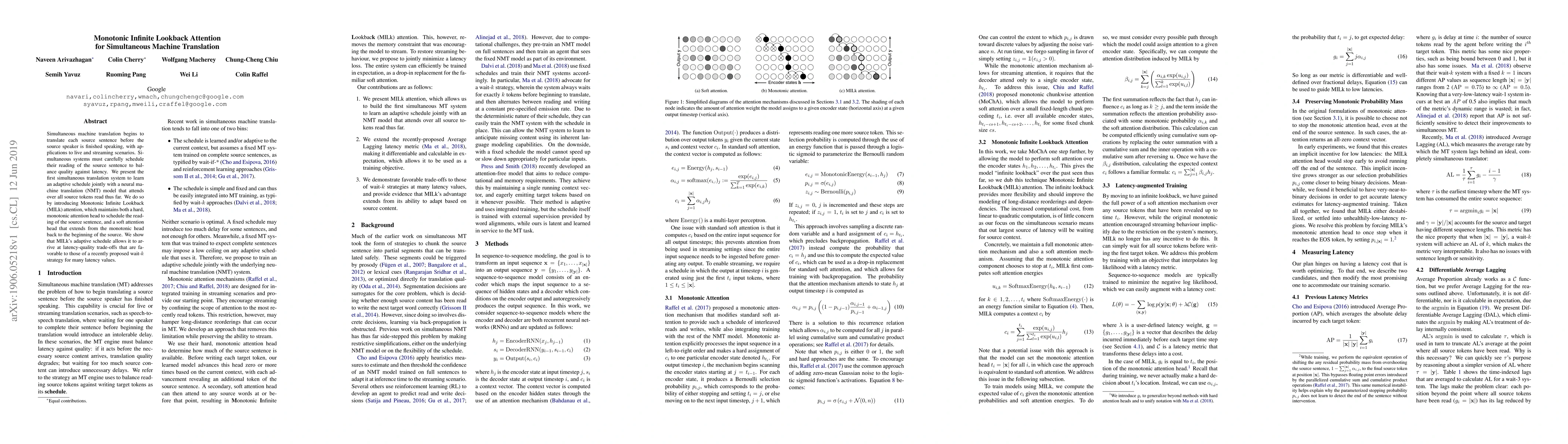 This paper introduces Monotonic Infinite Lookback (MILk) attention for simultaneous machine translation, which adaptively schedules the reading of source sentences to balance translation quality and latency. The system employs a hard, monotonic attention head for scheduling and a soft attention head for context, achieving better latency-quality trade-offs compared to a wait-k strategy.