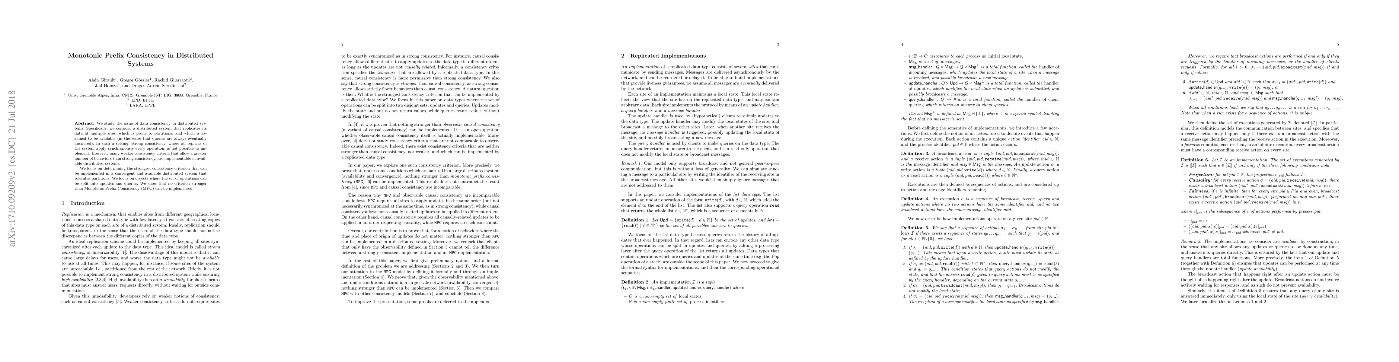 We study the issue of data consistency in distributed systems. Specifically, we consider a distributed system that replicates its data at multiple sites, which is prone to partitions, and which is assumed to be available (in the sense that queries are always eventually answered). In such a setting, strong consistency, where all replicas of the system apply synchronously every operation, is not possible to implement. However, many weaker consistency criteria that allow a greater number of behaviors than strong consistency, are implementable in available distributed systems. We focus on determining the strongest consistency criterion that can be implemented in a convergent and available distributed system that tolerates partitions. We focus on objects where the set of operations can be split into updates and queries. We show that no criterion stronger than Monotonic Prefix Consistency (MPC) can be implemented.