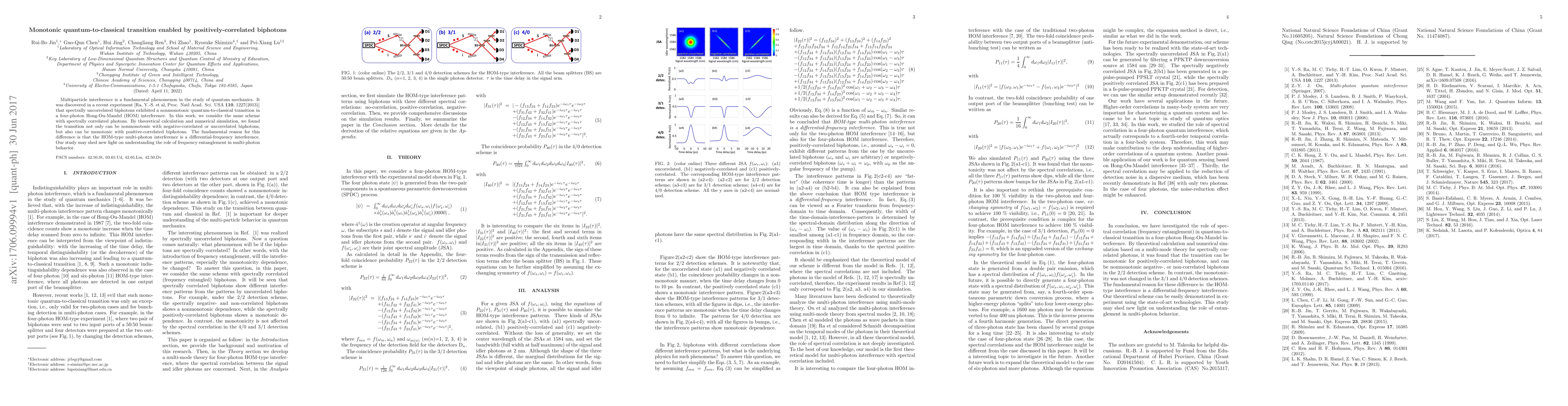 Multiparticle interference is a fundamental phenomenon in the study of quantum mechanics.It was discovered in a recent experiment [Ra, Y.-S. et al, Proc. Natl Acad. Sci. USA \textbf{110}, 1227(2013)] that spectrally uncorrelated biphotons exhibited a nonmonotonic quantum-to-classical transition in a four-photon Hong-Ou-Mandel (HOM) interference. In this work, we consider the same scheme with spectrally correlated photons.By theoretical calculation and numerical simulation, we found the transition not only can be nonmonotonic with negative-correlated or uncorrelated biphotons, but also can be monotonic with positive-correlated biphotons. The fundamental reason for this difference is that the HOM-type multi-photon interference is a differential-frequency interference. Our study may shed new light on understanding the role of frequency entanglement in multi-photon behavior.