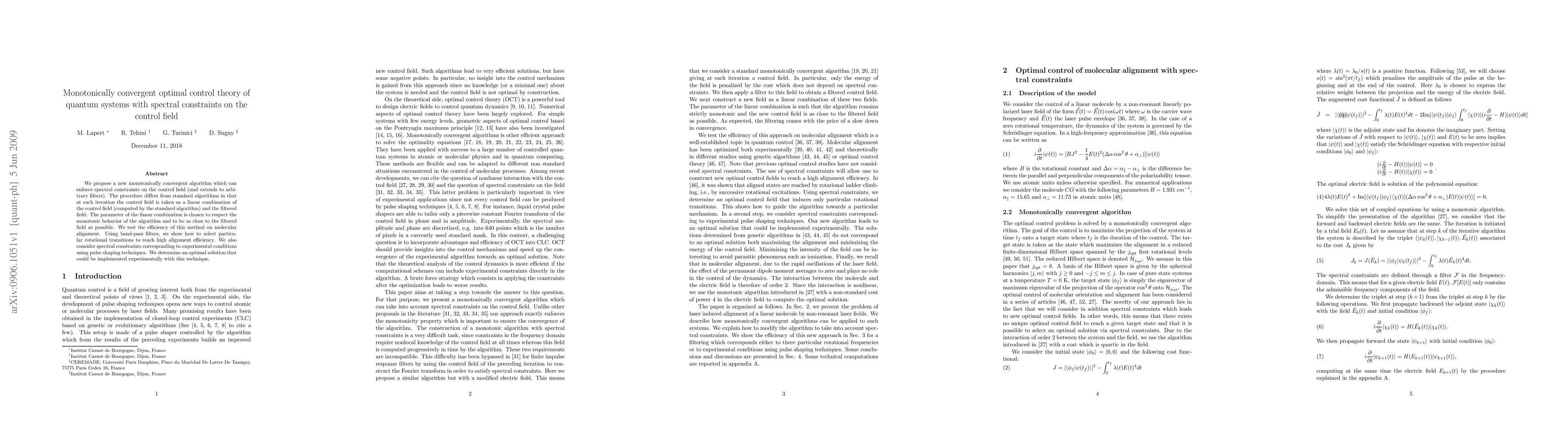 This paper introduces a novel monotonically convergent algorithm for optimal control of quantum systems, enforcing spectral constraints on the control field. The method iteratively refines the control field by combining standard computed fields with filtered fields, achieving high alignment efficiency in molecular systems.