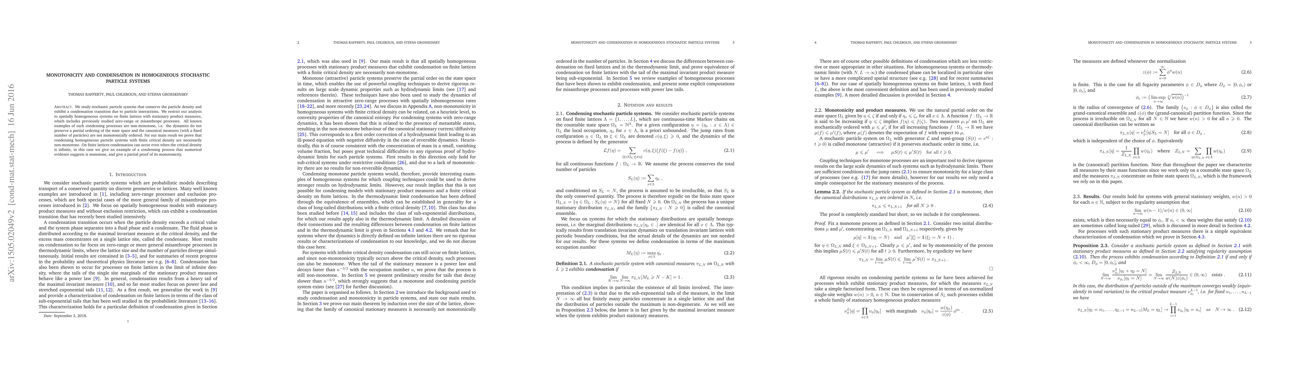 We study stochastic particle systems that conserve the particle density and exhibit a condensation transition due to particle interactions. We restrict our analysis to spatially homogeneous systems on finite lattices with stationary product measures, which includes previously studied zero-range or misanthrope processes. All known examples of such condensing processes are non-monotone, i.e. the dynamics do not preserve a partial ordering of the state space and the canonical measures (with a fixed number of particles) are not monotonically ordered. For our main result we prove that condensing homogeneous particle systems with finite critical density are necessarily non-monotone. On finite lattices condensation can occur even when the critical density is infinite, in this case we give an example of a condensing process that numerical evidence suggests is monotone, and give a partial proof of its monotonicity.