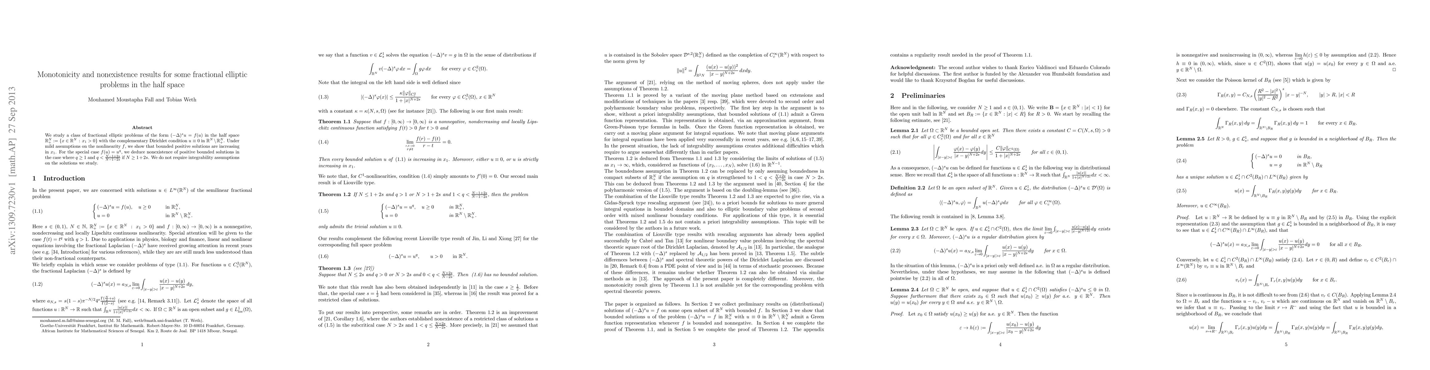 We study a class of fractional elliptic problems of the form $\Ds u= f(u)$ in the half space $\R^N_+:=\{x \in \R^N\::\: x_1>0\}$ with the complementary Dirichlet condition $u \equiv 0$ in $\R^N \setminus \R^N_+$. Under mild assumptions on the nonlinearity $f$, we show that bounded positive solutions are increasing in $x_1$. For the special case $f(u)=u^q$, we deduce nonexistence of positive bounded solutions in the case where $q \ge 1$ and $q<\frac{N-1+2s}{N-1-2s}$ if $N \ge 1+2s$. We do not require integrability assumptions on the solutions we study.