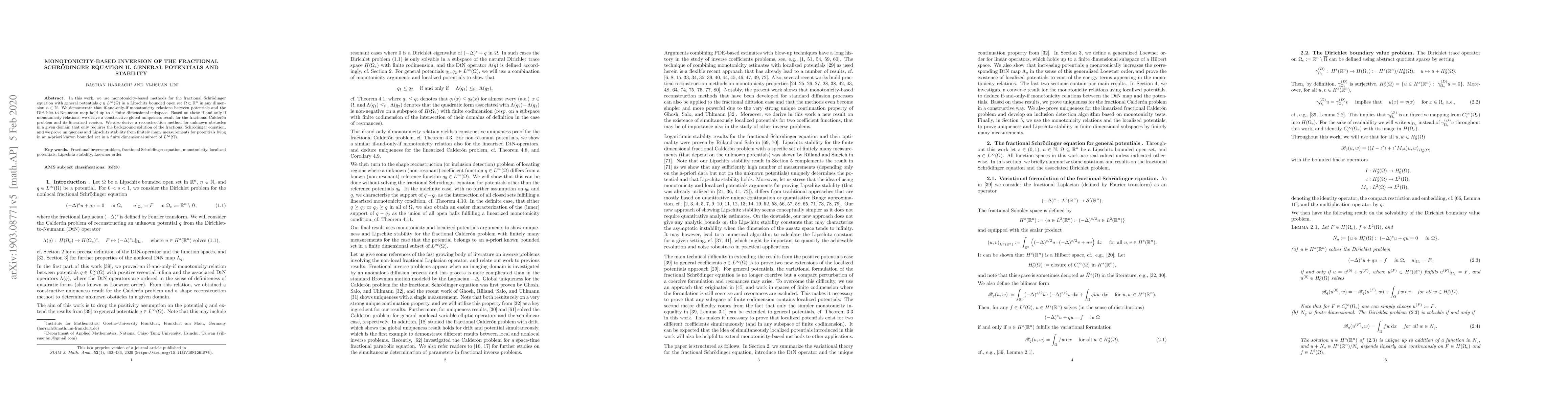 This paper employs monotonicity-based methods to solve the fractional Schrödinger equation with general potentials, proving global uniqueness and Lipschitz stability for the fractional Calderón problem. It also introduces a reconstruction method for unknown obstacles using background solutions, ensuring uniqueness and stability from limited measurements.