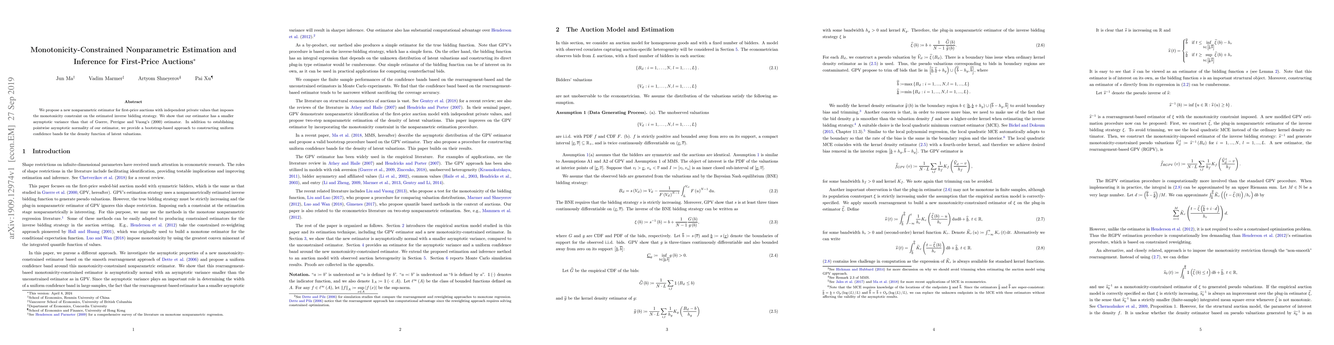 We propose a new nonparametric estimator for first-price auctions with independent private values that imposes the monotonicity constraint on the estimated inverse bidding strategy. We show that our estimator has a smaller asymptotic variance than that of Guerre, Perrigne and Vuong's (2000) estimator. In addition to establishing pointwise asymptotic normality of our estimator, we provide a bootstrap-based approach to constructing uniform confidence bands for the density function of latent valuations.