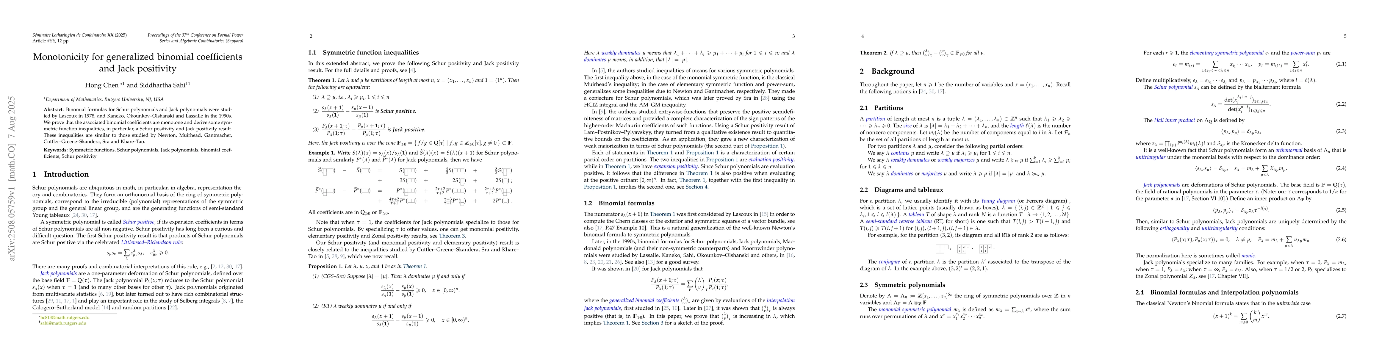 Binomial formulas for Schur polynomials and Jack polynomials were studied by Lascoux in 1978, and Kaneko, Okounkov--Olshanski and Lassalle in the 1990s. We prove that the associated binomial coefficients are monotone and derive some symmetric function inequalities, in particular, a Schur positivity and Jack positivity result. These inequalities are similar to those studied by Newton, Muirhead, Gantmacher, Cuttler--Greene--Skandera, Sra and Khare--Tao.