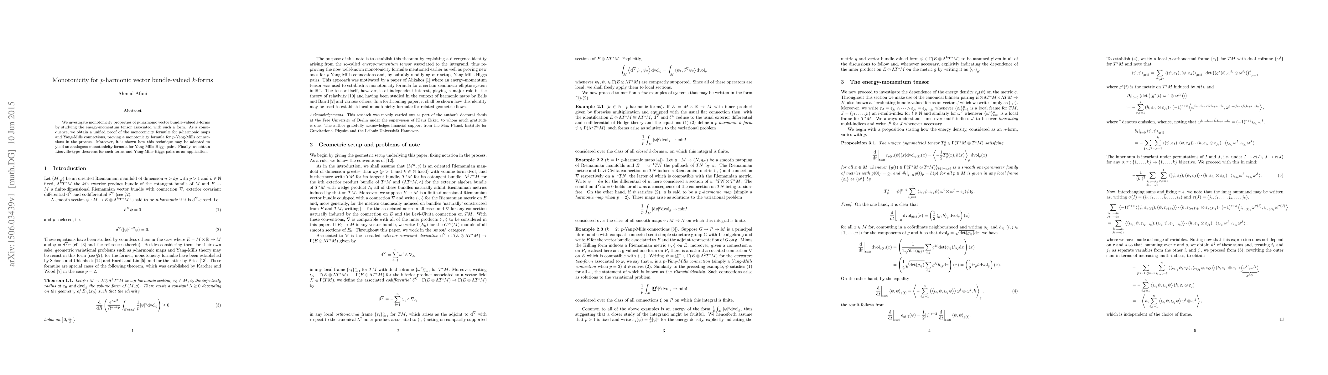 We investigate monotonicity properties of $p$-harmonic vector bundle-valued $k$-forms by studying the energy-momentum tensor associated with such a form. As a consequence, we obtain a unified proof of the monotonicity formul{\ae} for $p$-harmonic maps and Yang-Mills connections, proving a monotonicity formula for $p$-Yang-Mills connections in the process. Moreover, it is shown how this technique may be adapted to yield an analogous monotonicity formula for Yang-Mills-Higgs pairs. Finally, we obtain Liouville-type theorems for such forms and Yang-Mills-Higgs pairs as an application.