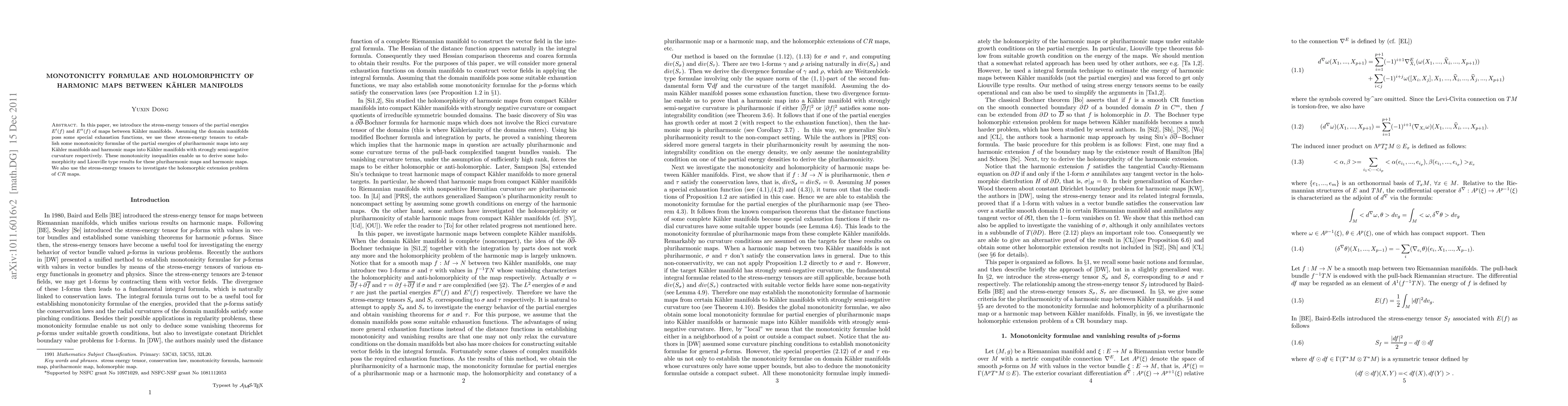 This paper introduces stress-energy tensors for partial energies of maps between Kähler manifolds and uses them to establish monotonicity formulae for pluriharmonic and harmonic maps. These results lead to holomorphicity and Liouville-type theorems for these maps and explore the holomorphic extension of CR maps.