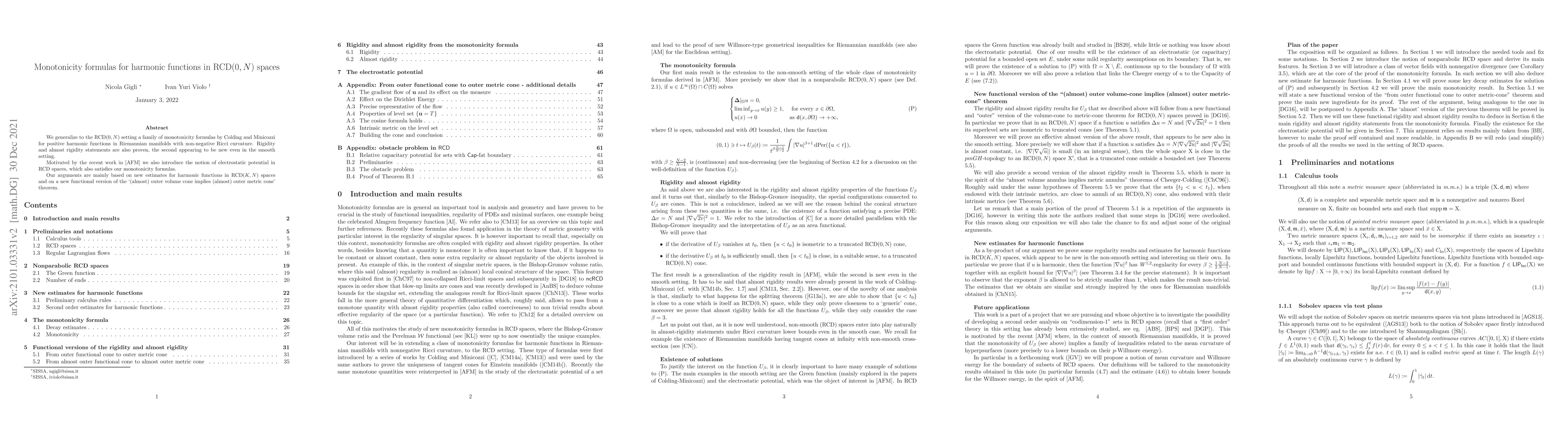 This paper generalizes monotonicity formulas for harmonic functions from Riemannian manifolds with non-negative Ricci curvature to ${\rm RCD}(0,N)$ spaces. It also introduces electrostatic potential in ${\rm RCD}$ spaces and proves new rigidity and almost rigidity statements.