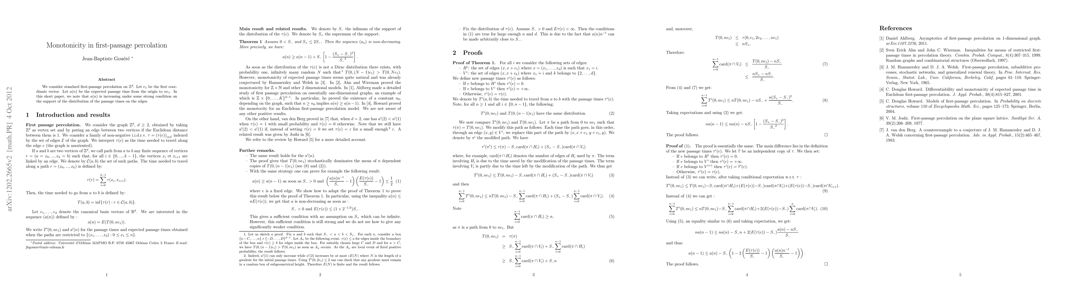 Summary: This paper examines first-passage percolation on $\Z^d$ and demonstrates that the expected passage time from the origin to $ne_1$ increases under specific conditions on the distribution of edge passage times. The monotonicity of this time function is established under a strong condition on the edge weights.