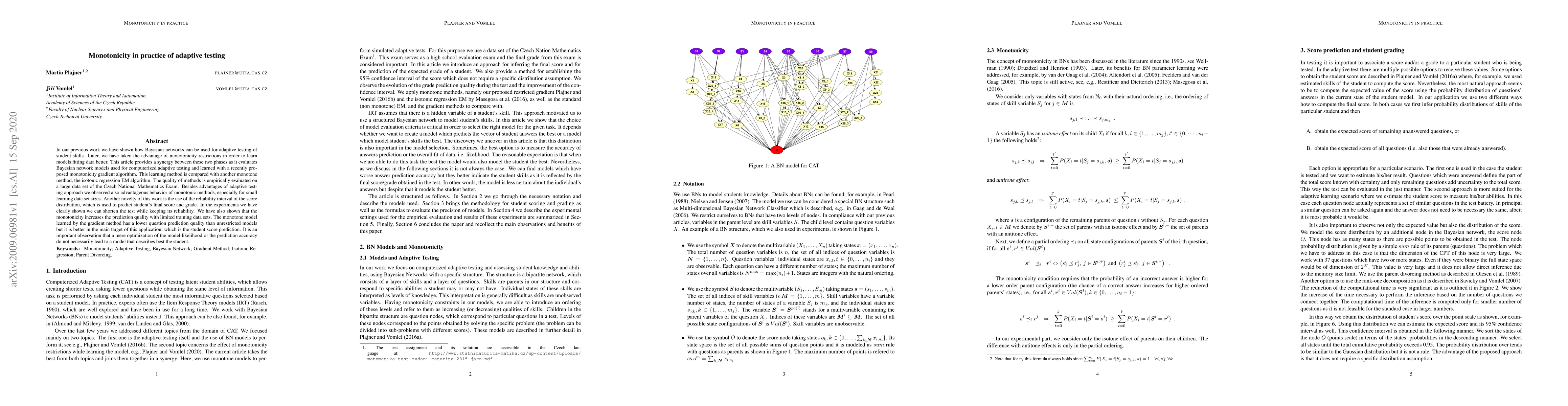 This paper evaluates Bayesian network models for adaptive testing, employing a monotonicity gradient algorithm to improve model learning. The study finds that monotonic methods enhance prediction quality, especially with limited training data, and can shorten tests while maintaining reliability.