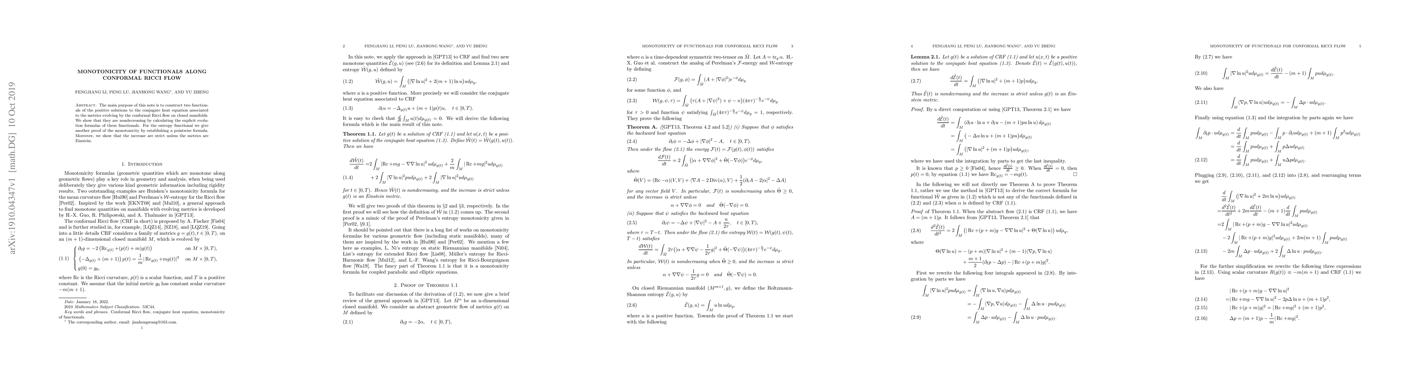 This paper constructs and analyzes two functionals of positive solutions to the conjugate heat equation under conformal Ricci flow on closed manifolds, proving their nondecreasing nature through explicit evolution formulas and a pointwise formula for the entropy functional. The increase is shown to be strict unless the metrics are Einstein.