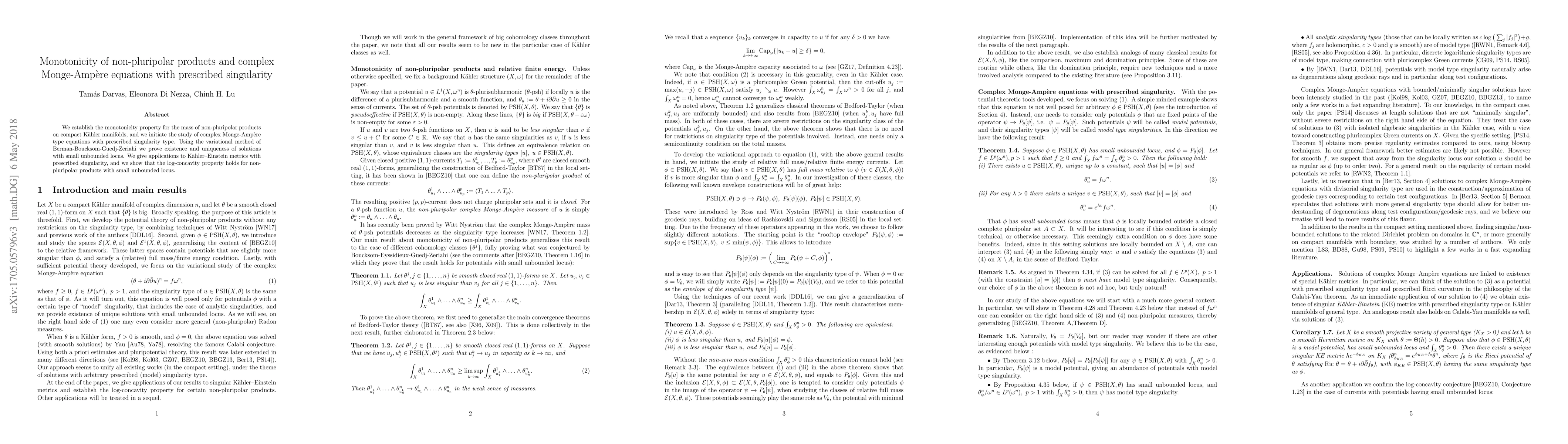 This paper establishes the monotonicity of non-pluripolar products on compact Kähler manifolds and explores complex Monge-Ampère equations with prescribed singularities, proving their existence and uniqueness. It applies these findings to Kähler-Einstein metrics with specified singularities and demonstrates log-concavity for such products.