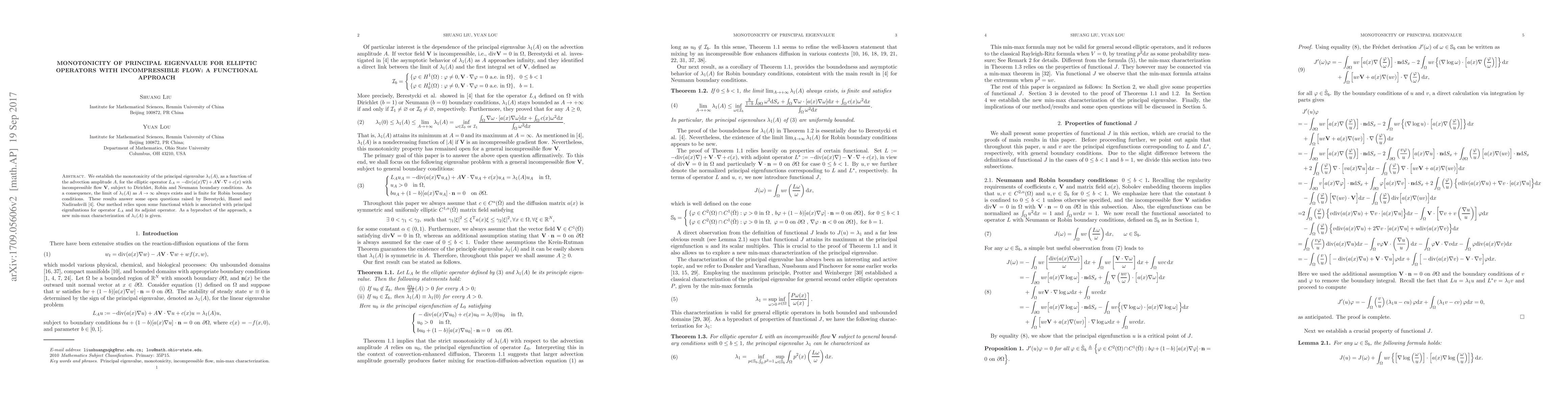 We establish the monotonicity of the principal eigenvalue $\lambda_1(A)$, as a function of the advection amplitude $A$, for the elliptic operator $L_{A}=-\mathrm{div}(a(x)\nabla)+A\mathbf{V}\cdot\nabla +c(x)$ with incompressible flow $\mathbf{V}$, subject to Dirichlet, Robin and Neumann boundary conditions. As a consequence, the limit of $\lambda_1(A)$ as $A\to \infty$ always exists and is finite for Robin boundary conditions. These results answer some open questions raised by [Berestycki, H., Hamel, F., Nadirashvili, N.: Elliptic eigenvalue problems with large drift and applications to nonlinear propagation phenomena, Commun. Math. Phys. 253, 451-480 (2005)]. Our method relies upon some functional which is associated with principal eigenfuntions for operator $L_A$ and its adjoint operator. As a byproduct of the approach, a new min-max characterization of $\lambda_1(A)$ is given.
