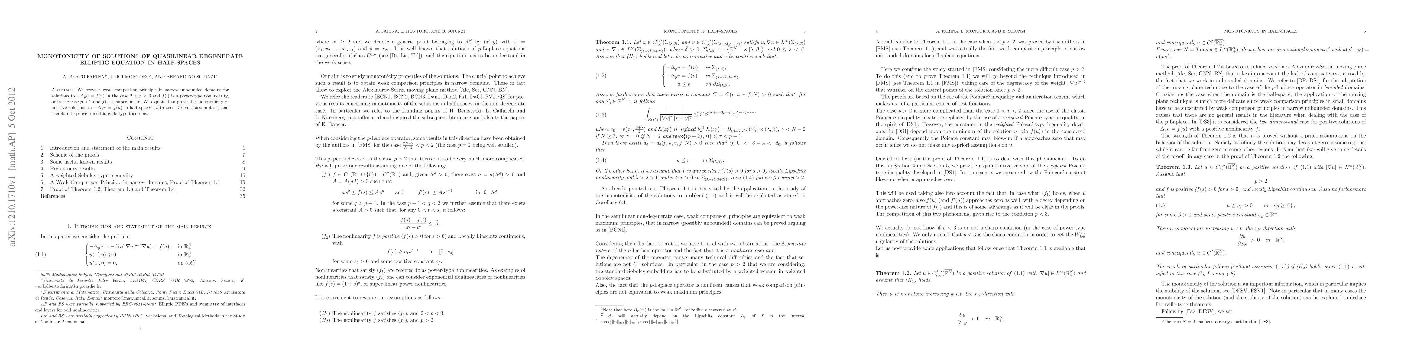 This paper establishes a weak comparison principle for quasilinear degenerate elliptic equations in narrow unbounded domains, proving monotonicity of positive solutions in half-spaces under specific conditions on $p$ and $f(u)$. It also derives Liouville-type theorems from these results.