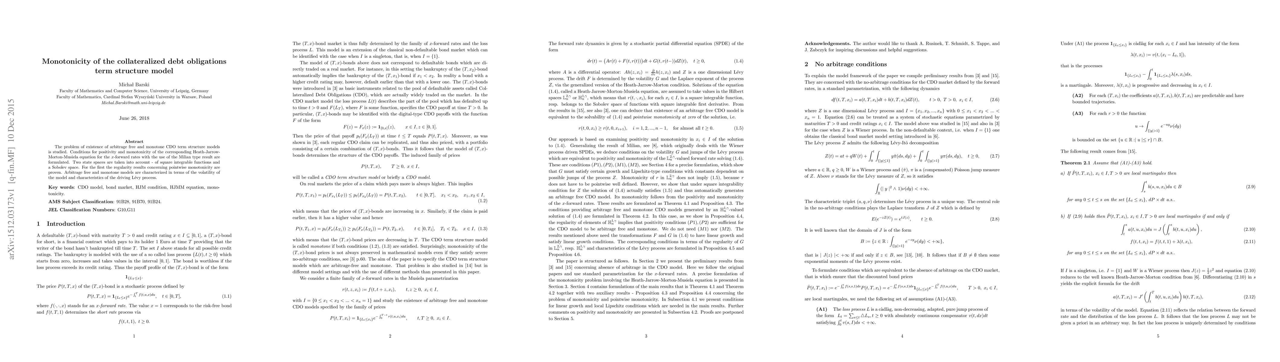 This research formulates conditions for arbitrage-free and monotone Collateralized Debt Obligation (CDO) term structure models, using Heath-Jarrow-Morton-Musiela equation and Milian type results. It proves regularity results for pointwise monotonicity on square integrable functions and Sobolev space state spaces. The study characterizes arbitrage-free and monotone models based on the volatility and Lévy process characteristics.