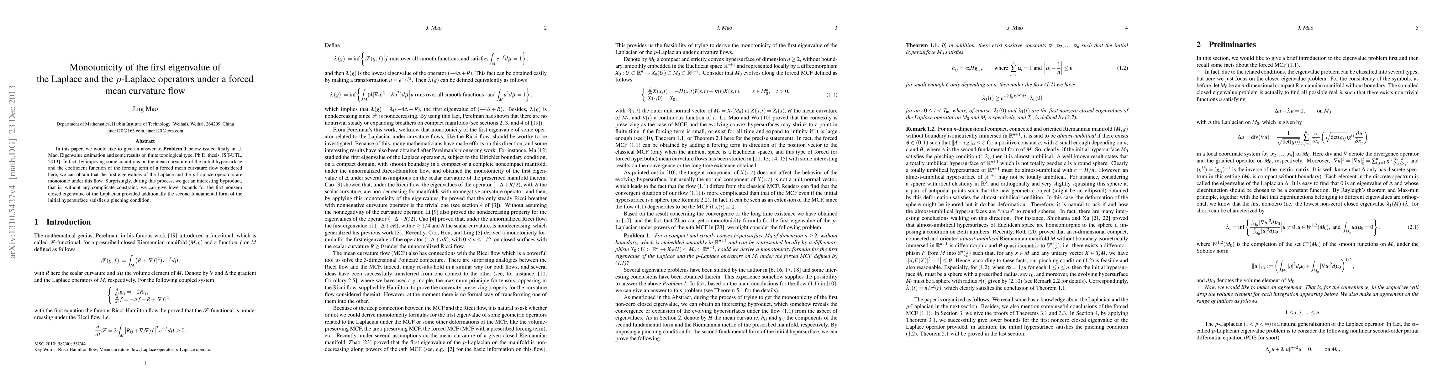 In this paper, we would like to give an answer to \textbf{Problem 1} below issued firstly in [J. Mao, Eigenvalue estimation and some results on finite topological type, Ph.D. thesis, IST-UTL, 2013]. In fact, by imposing some conditions on the mean curvature of the initial hypersurface and the coefficient function of the forcing term of a forced mean curvature flow considered here, we can obtain that the first eigenvalues of the Laplace and the $p$-Laplace operators are monotonic under this flow. Surprisingly, during this process, we get an interesting byproduct, that is, without any complicated constraint, we can give lower bounds for the first nonzero closed eigenvalue of the Laplacian provided additionally the second fundamental form of the initial hypersurface satisfies a pinching condition.