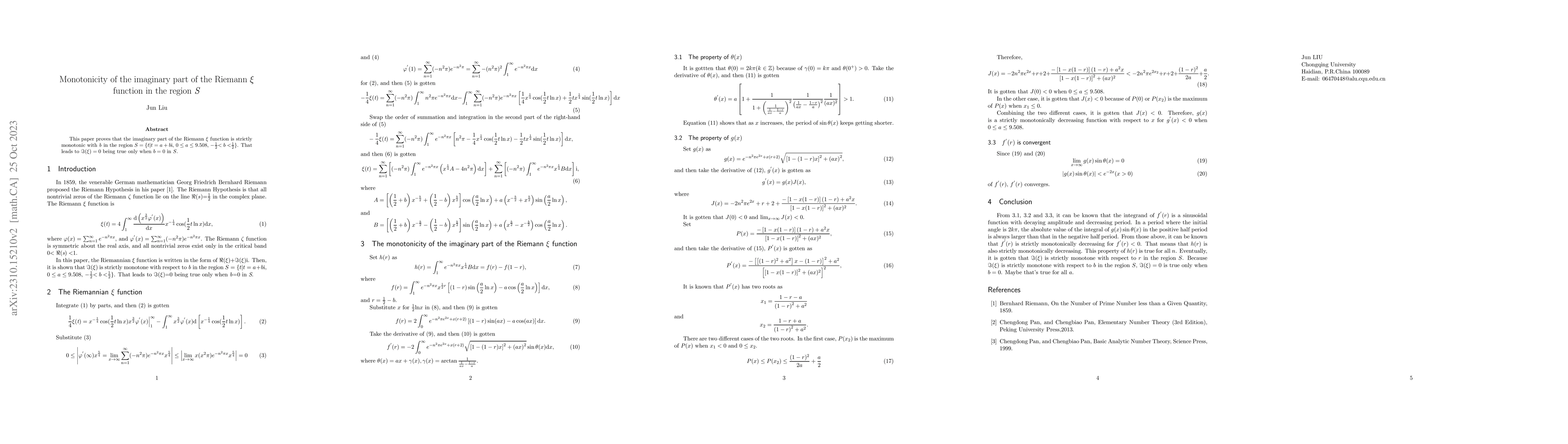 This paper proves that the imaginary part of the Riemann $\xi$ function is strictly monotonic with $b$ in the region $S = \{t|t=a+bi,\ 0\leq a \leq 9.508,\ -1/2