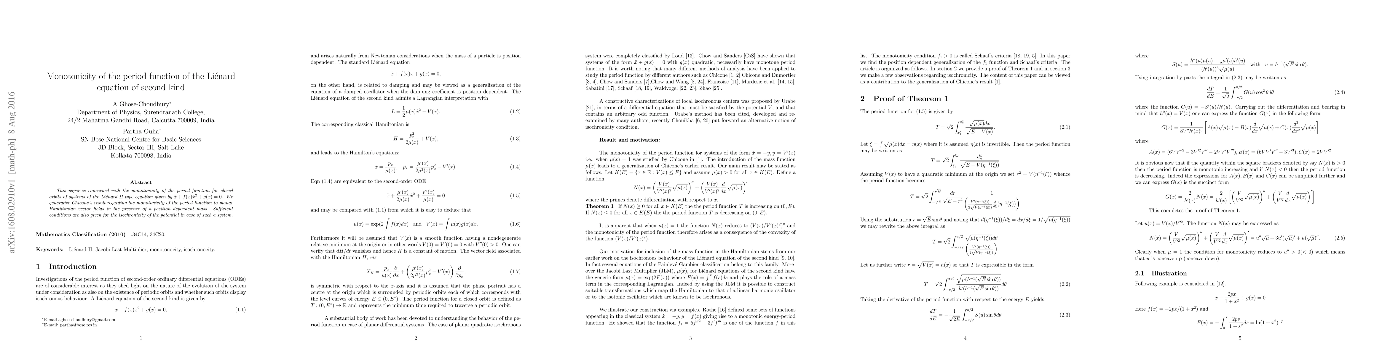 This paper is concerned with the monotonicity of the period function for closed orbits of systems of the Li\'enard II type equation given by $\ddot{x} + f(x)\dot{x}^{2} + g(x) = 0$. We generalize Chicone's result regarding the monotonicity of the period function to planar Hamiltonian vector fields in the presence of a position dependent mass. Sufficient conditions are also given for the isochronicity of the potential in case of such a system.