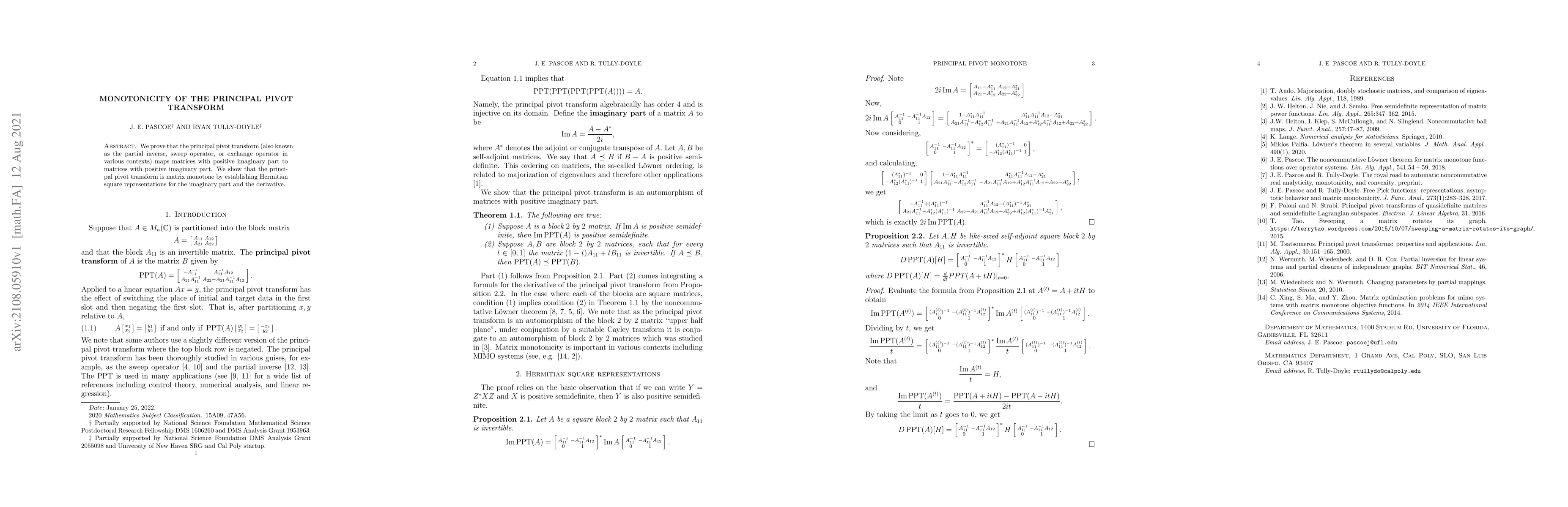 Summary: This paper proves the monotonicity of the principal pivot transform, demonstrating that it maps matrices with positive imaginary parts to those with positive imaginary parts, and establishes Hermitian square representations for the imaginary part and its derivative to support this monotonicity.