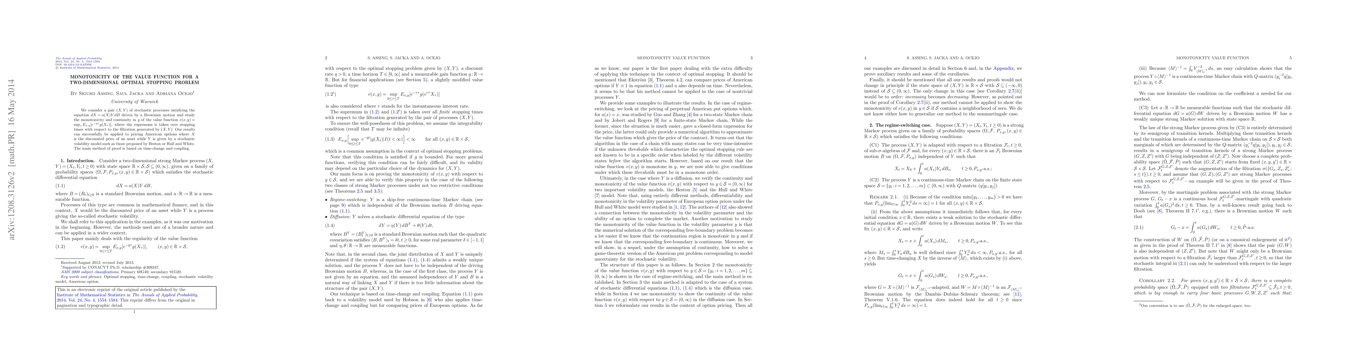 We consider a pair $(X,Y)$ of stochastic processes satisfying the equation $dX=a(X)Y\,dB$ driven by a Brownian motion and study the monotonicity and continuity in $y$ of the value function $v(x,y)=\sup_{\tau}E_{x,y}[e^{-q\tau}g(X_{\tau})]$, where the supremum is taken over stopping times with respect to the filtration generated by $(X,Y)$. Our results can successfully be applied to pricing American options where $X$ is the discounted price of an asset while $Y$ is given by a stochastic volatility model such as those proposed by Heston or Hull and White. The main method of proof is based on time-change and coupling.