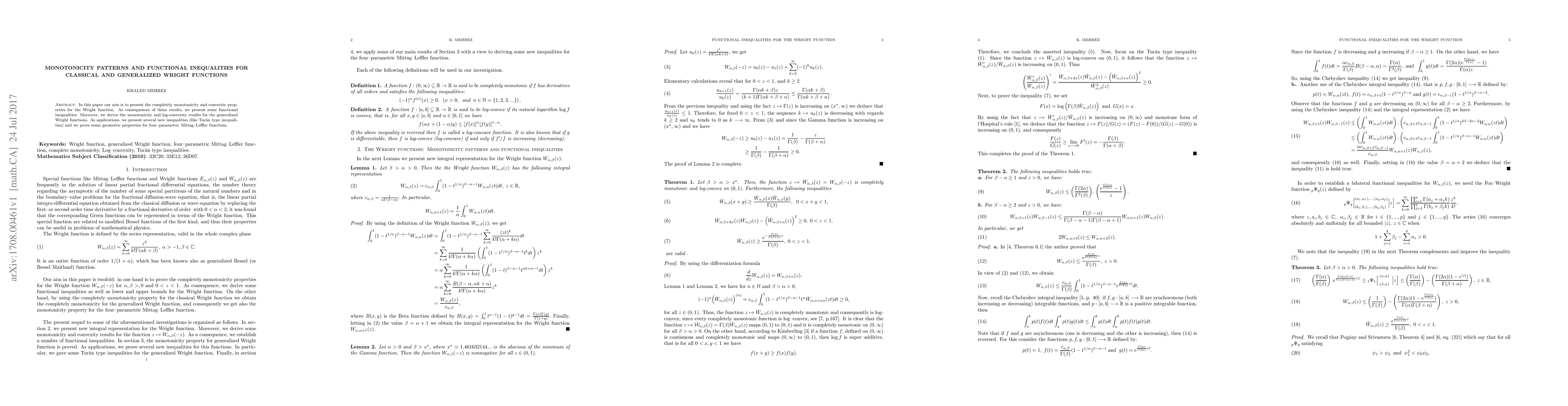This paper investigates the monotonicity, convexity, and log-convexity properties of the Wright and generalized Wright functions, leading to the derivation of new functional inequalities and geometric properties for four-parametric Mittag-Leffler functions.