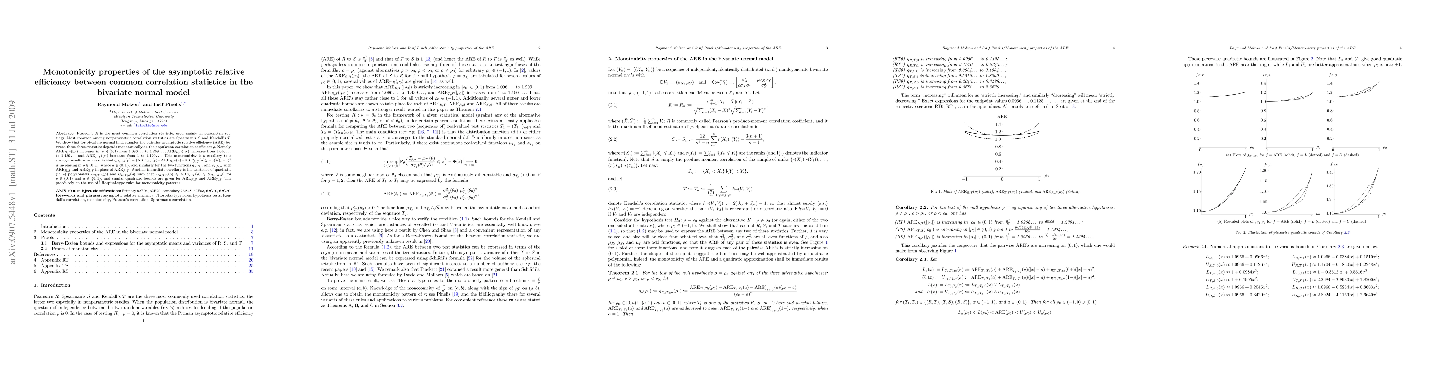 Pearson's is the most common correlation statistic, used mainly in parametric settings. Most common among nonparametric correlation statistics are Spearman's and Kendall's. We show that for bivariate normal i.i.d. samples the pairwise asymptotic relative efficiency between these three statistics depends monotonically on the population correlation coefficient. This monotonicity is a corollary to a stronger result. The proofs rely on the use of l'Hospital-type rules for monotonicity patterns.