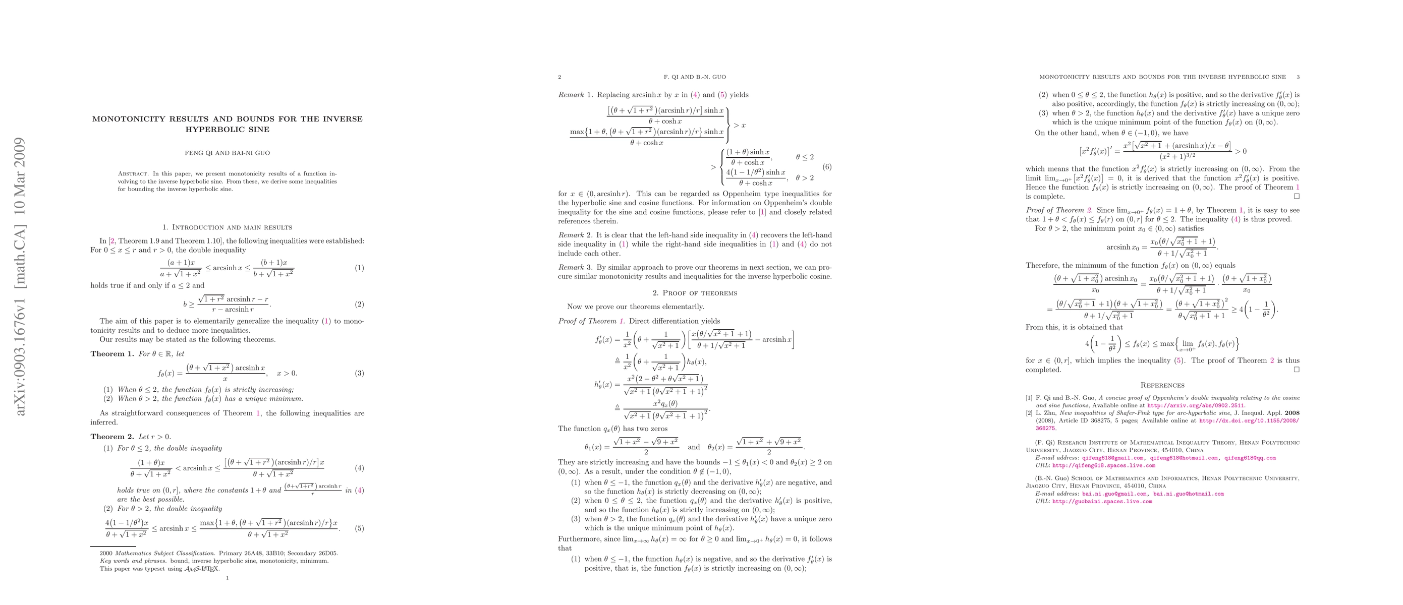 This paper derives monotonicity results for the inverse hyperbolic sine function, leading to bounding inequalities.