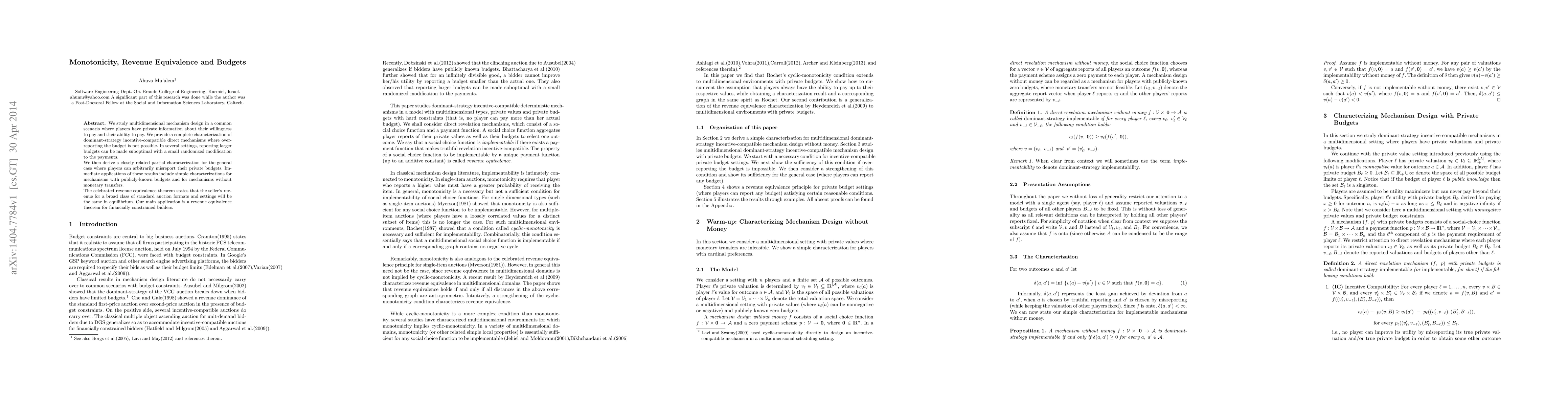 We study multidimensional mechanism design in a common scenario where players have private information about their willingness to pay and their ability to pay. We provide a complete characterization of dominant-strategy incentive-compatible direct mechanisms where over-reporting the budget is not possible. In several settings, reporting larger budgets can be made suboptimal with a small randomized modification to the payments. We then derive a closely related partial characterization for the general case where players can arbitrarily misreport their private budgets. Immediate applications of these results include simple characterizations for mechanisms with publicly-known budgets and for mechanisms without monetary transfers. The celebrated revenue equivalence theorem states that the seller"s revenue for a broad class of standard auction formats and settings will be the same in equilibrium. Our main application is a revenue equivalence theorem for financially constrained bidders.