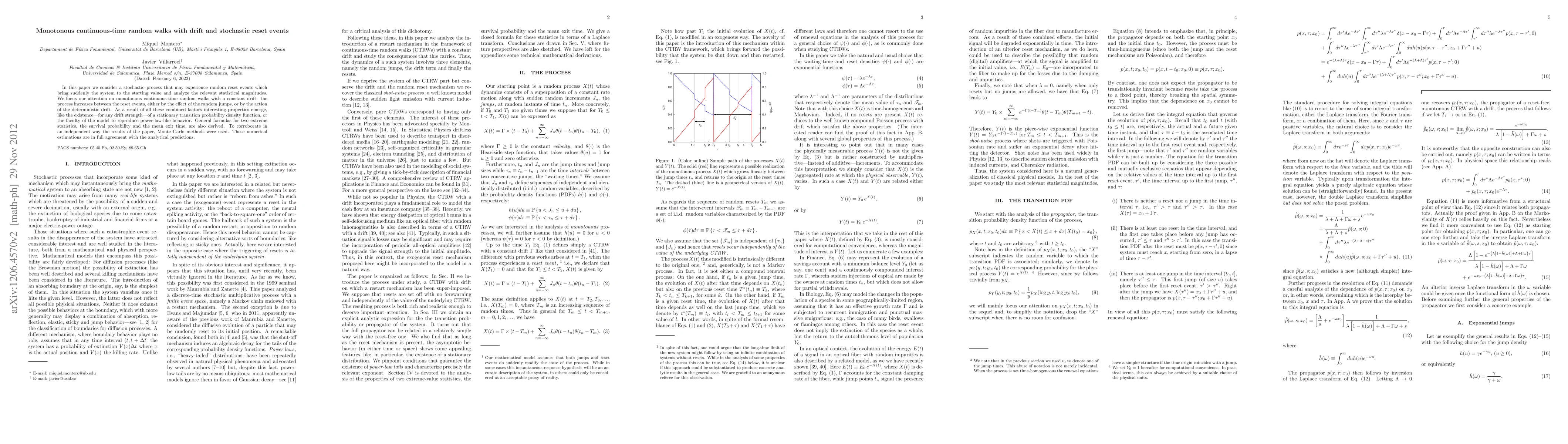 In this paper we consider a stochastic process that may experience random reset events which bring suddenly the system to the starting value and analyze the relevant statistical magnitudes. We focus our attention on monotonous continuous-time random walks with a constant drift: the process increases between the reset events, either by the effect of the random jumps, or by the action of the deterministic drift. As a result of all these combined factors interesting properties emerge, like the existence|for any drift strength|of a stationary transition probability density function, or the faculty of the model to reproduce power-law-like behavior. General formulas for two extreme statistics, the survival probability and the mean exit time, are also derived. To corroborate in an independent way the results of the paper, Monte Carlo methods were used. These numerical estimations are in full agreement with the analytical predictions.