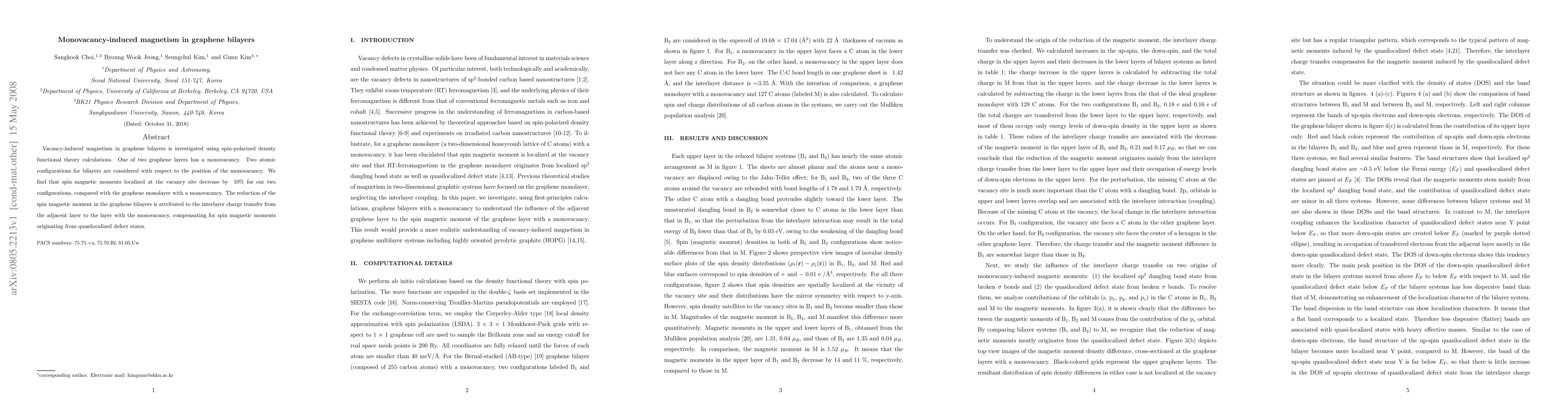 Summary: Spin-polarized DFT calculations reveal that a monovacancy in a graphene bilayer induces magnetism, with the spin magnetic moment decreasing by ~10% compared to a monolayer with a monovacancy. This reduction is due to interlayer charge transfer compensating the spin magnetic moments from the defect state.
