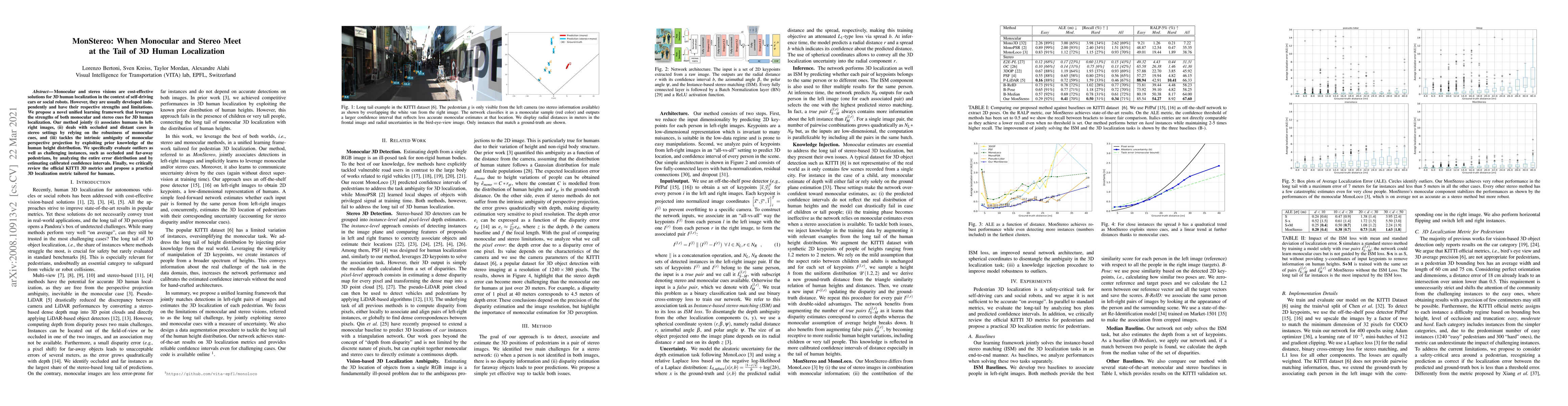 Monocular and stereo visions are cost-effective solutions for 3D human localization in the context of self-driving cars or social robots. However, they are usually developed independently and have their respective strengths and limitations. We propose a novel unified learning framework that leverages the strengths of both monocular and stereo cues for 3D human localization. Our method jointly (i) associates humans in left-right images, (ii) deals with occluded and distant cases in stereo settings by relying on the robustness of monocular cues, and (iii) tackles the intrinsic ambiguity of monocular perspective projection by exploiting prior knowledge of the human height distribution. We specifically evaluate outliers as well as challenging instances, such as occluded and far-away pedestrians, by analyzing the entire error distribution and by estimating calibrated confidence intervals. Finally, we critically review the official KITTI 3D metrics and propose a practical 3D localization metric tailored for humans.