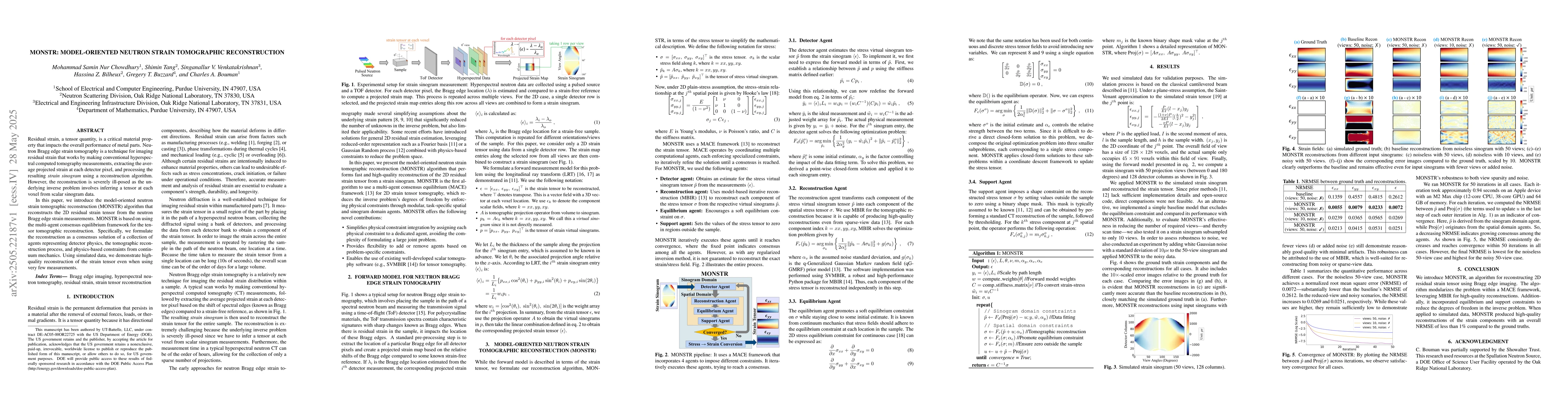 The model-oriented neutron strain tomographic reconstruction (MONSTR) algorithm, which uses a multi-agent consensus equilibrium framework for tensor tomographic reconstruction.