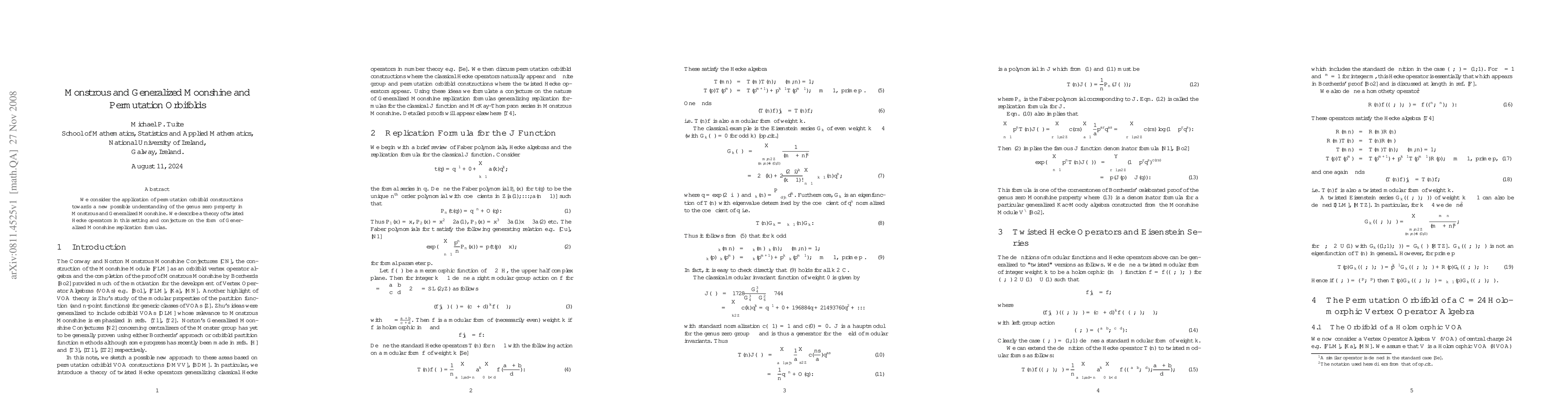 This paper explores the use of permutation orbifold constructions to better understand the genus zero property in Monstrous and Generalized Moonshine, proposing a theory of twisted Hecke operators and hypothesizing on Generalized Moonshine replication formulas.